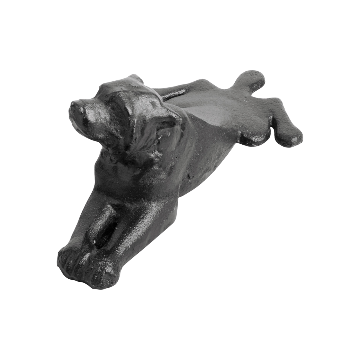 Nooit meer dichtslaande deuren, dankzij deze gietijzeren deurstopper in de vorm van een hond. Door zijn schuin toelopende vorm klemt de wig zich onder de deur vast. Deze decoratief gietijzeren wig is met de hand gegoten volgens eeuwenoud vakmanschap en traditie.