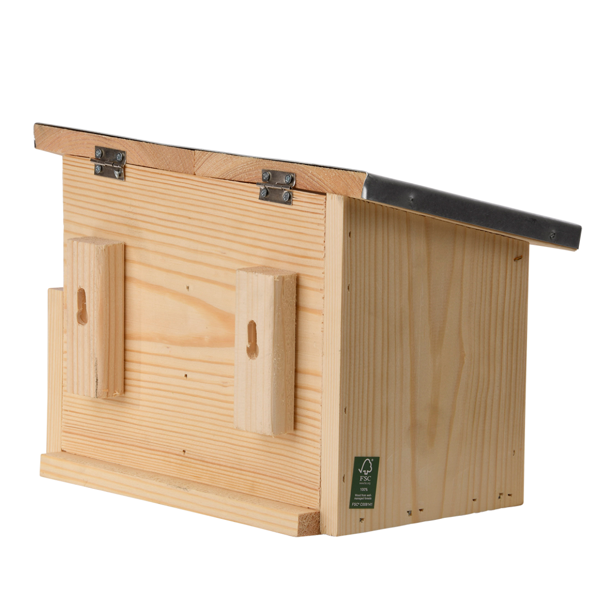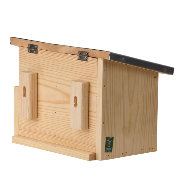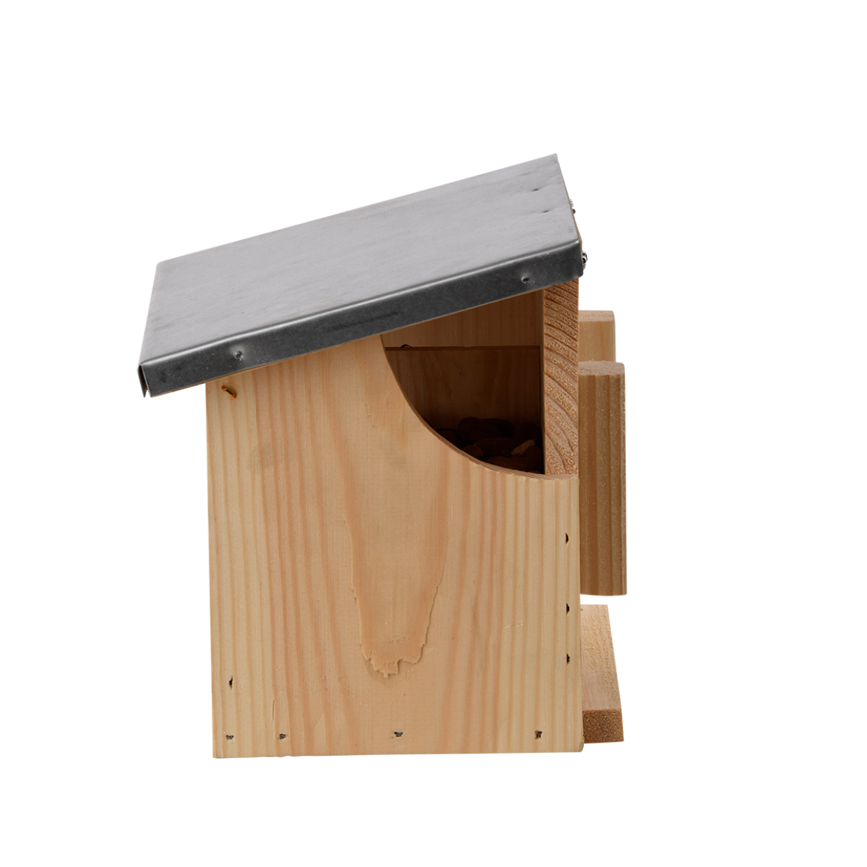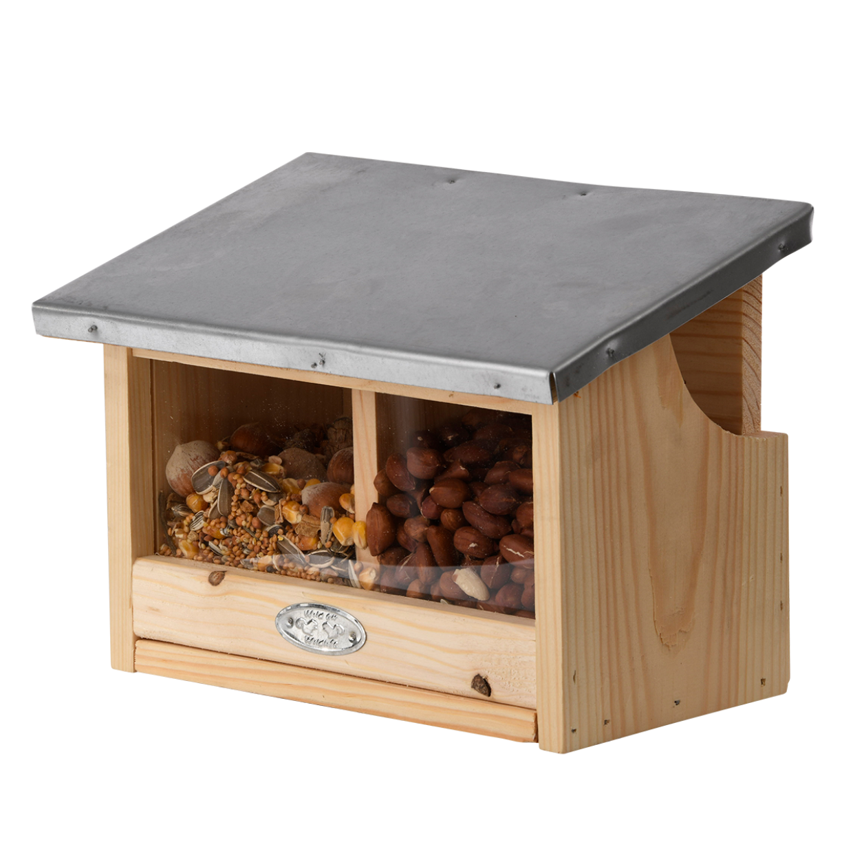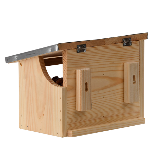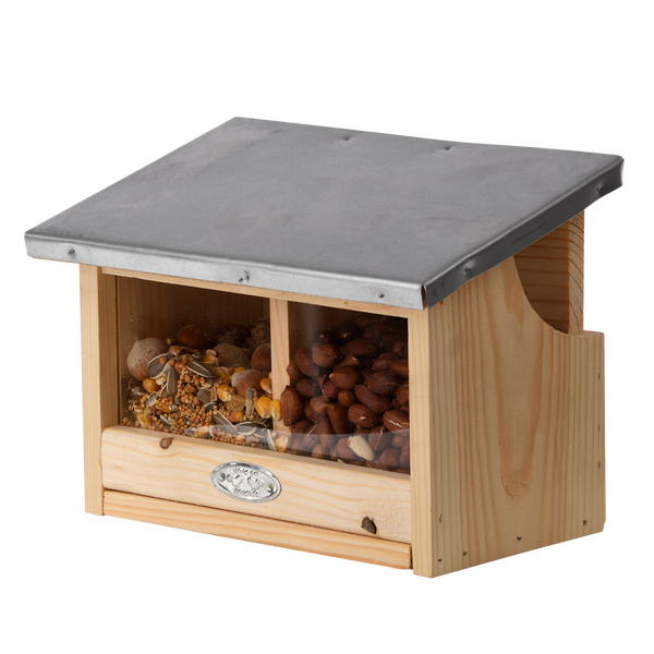 Eekhoorn voederhuis Dubbel Bij Vogelhuisjes.nl vindt u een voederoptie voor veel tuindieren. Zo ook voor de eekhoorn. Met een eekhoorn voederhuis wordt de kans dat een eekhoorn jouw tuin bezoekt een stuk groter! Dit mooie voederhuis heeft twee openingen, waardoor meerdere eekhoorns gelijktijdig van hun maaltijd kunnen genieten. Het voederhuis is uitrust met een zinken dak en is gemaakt van FSC gecertificeerd hout. Hij heeft een afmeting van circa 25 x 18 x 19 centimeter.