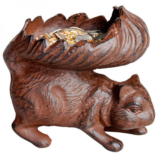 Eekhoorns zijn graag geziene gasten in de tuin. Dit exemplaar biedt vogels en eekhoorns een fijne voederplaats. De staart van de eekhoorn is zo ontworpen dat het een bakje vormt. Dit bakje kan men voorzien van voer of water. Dit decoratieve gietijzeren dierfiguur is per stuk met de hand gegoten volgens eeuwenoud vakmanschap en traditie.