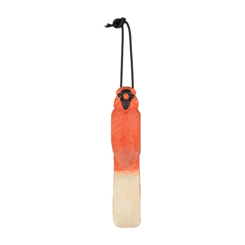 De noordelijke kardinale schoenlepel is een handgesneden en realistisch gebeeldhouwde houten vogel, waar de staartveren de eigenlijke schoenlepel vormen.De noordelijke kardinaal is een kleurrijke zangvogel uit het oosten van de Verenigde Staten die zich heeft verspreid van de zuidelijke staten tot het uiterste noorden tot aan de Canadese grens. Het nestelt bijna overal, zolang er struiken in de buurt zijn. Het mannetje is erg territoriaal en verdedigt zijn territorium met zowel zang als agressie, maar tijdens de paartijd laat hij zijn zachtere kant zien door het vrouwtje na te streven en haar te voeden.