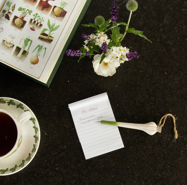Eindelijk kunnen liefhebbers van zowel tuinieren als knoflook hun hart ophalen! Mensen die authentieke, humoristische geschenken willen geven, kiezen voor een handbeschilderde, handgesneden pen van echt hout. Behalve knoflook zijn er meer groentepennen, waar je allemaal mee kunt schrijven, ook prei en sperziebonen bijvoorbeeld.