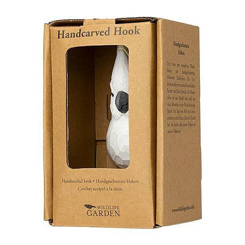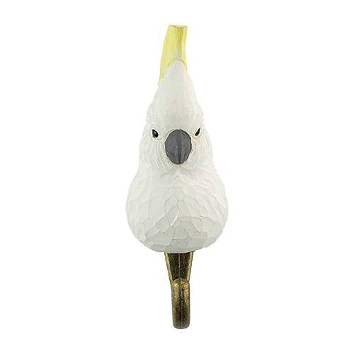 De kaketoe met zwavelkuif is een prachtige witte papegaai met een gele verenkuif op zijn kop. De decoratieve haken van Wildlife Garden zijn met de hand gesneden en met de hand geschilderde houten sculpturen die aan een metalen haak zijn bevestigd. Over de Sulphur-crested Cockatoo: De nieuwsgierige, spraakzame en intelligente kaketoe met zwavelkuif is waarschijnlijk de bekendste kaketoe. Het is ook een van de luidste Australische vogels en leeft in grote kolonies van wel honderd individuen. Gevonden in zowel Tasmanië als Oost- en Noord-Australië nestelen ze het liefst in boomholten of klifgroeven waar ze 2-3 eieren leggen. De kuikens komen na vier weken uit en zijn na 70 dagen vliegklaar.