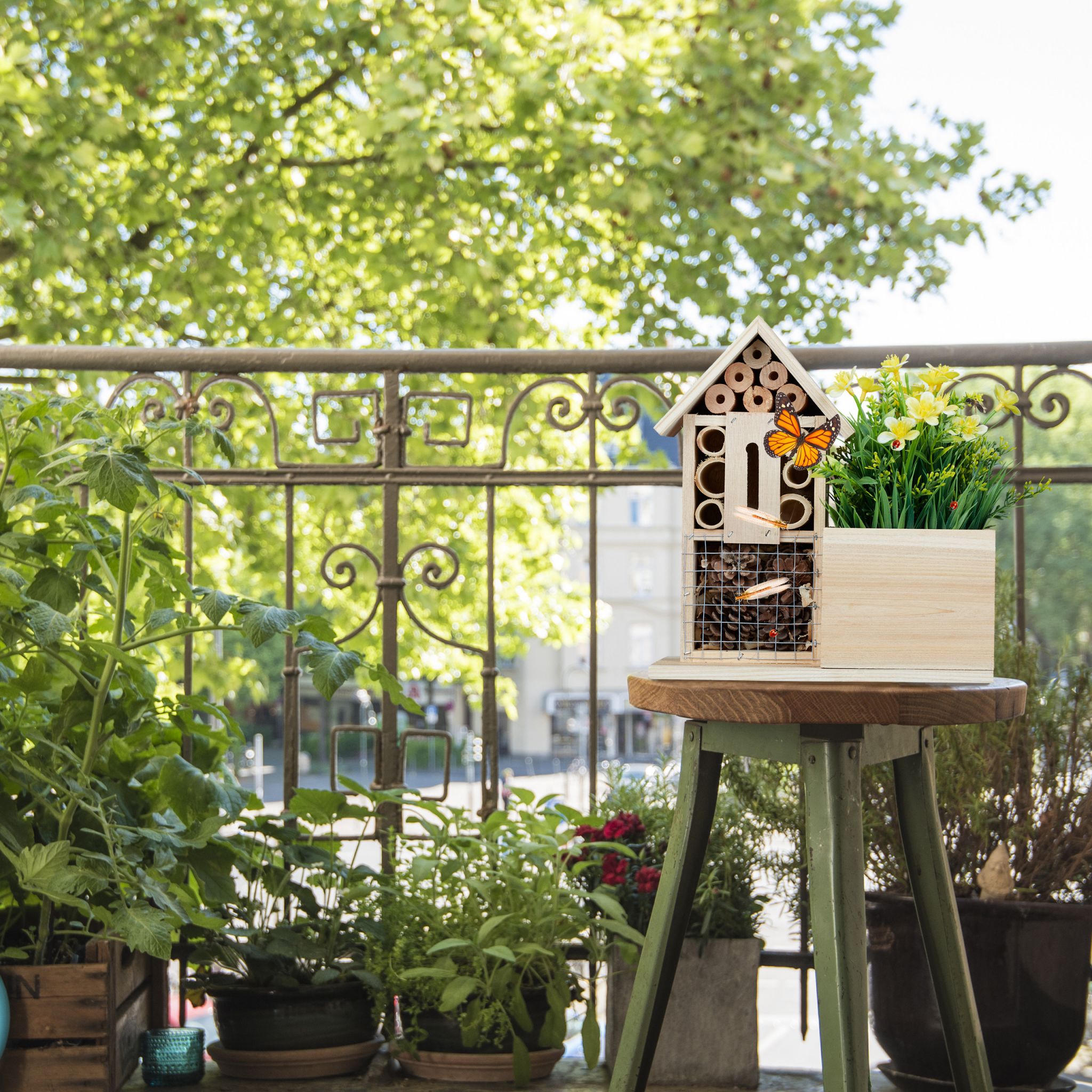 Klein insectenhuis met bloembak