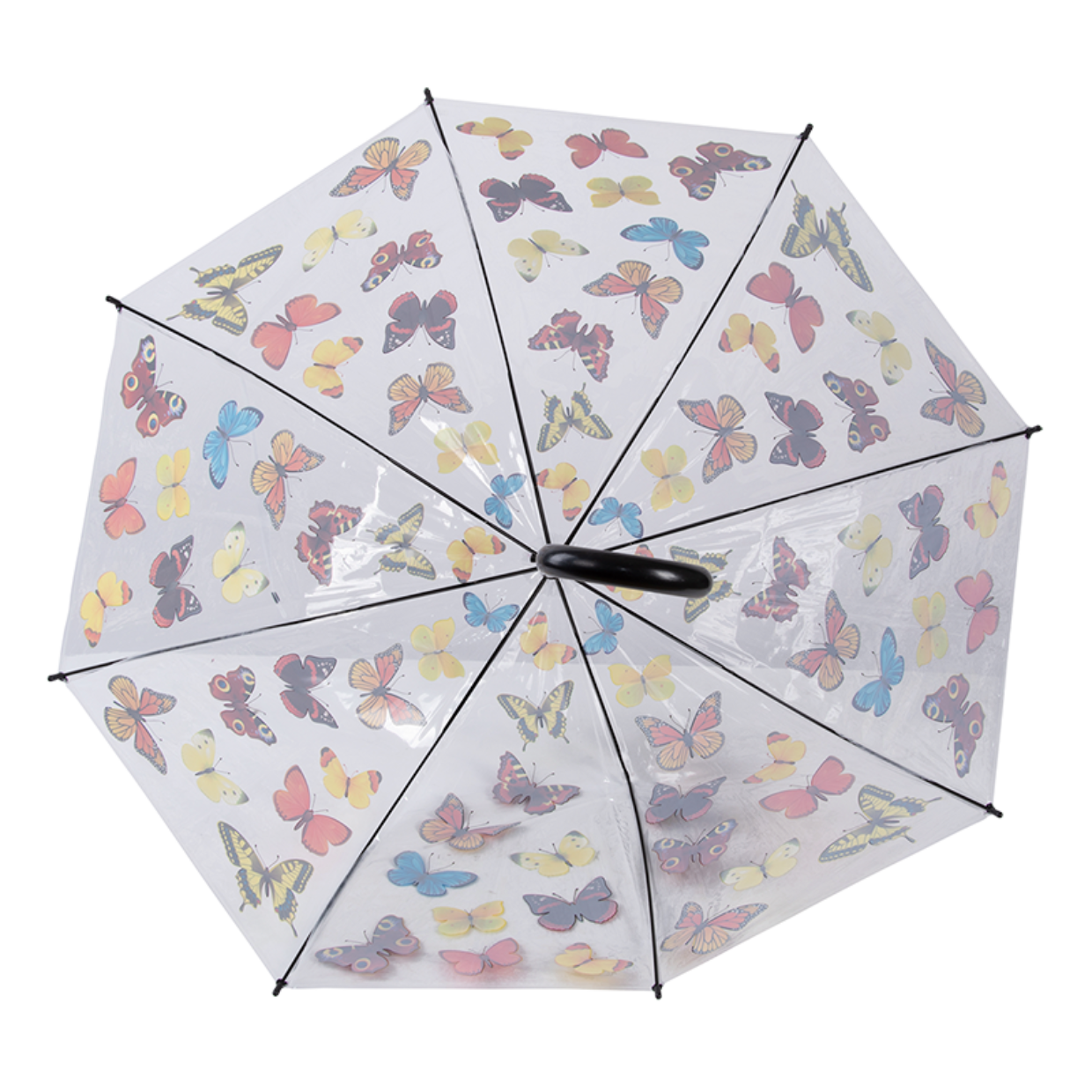 Deze transparante paraplu met vlinderprint maakt wandelen in de regen leuk. Omdat het materiaal transparant is, is de omgeving goed te zien tijdens het wandelen.