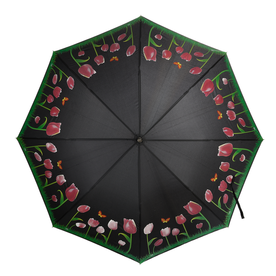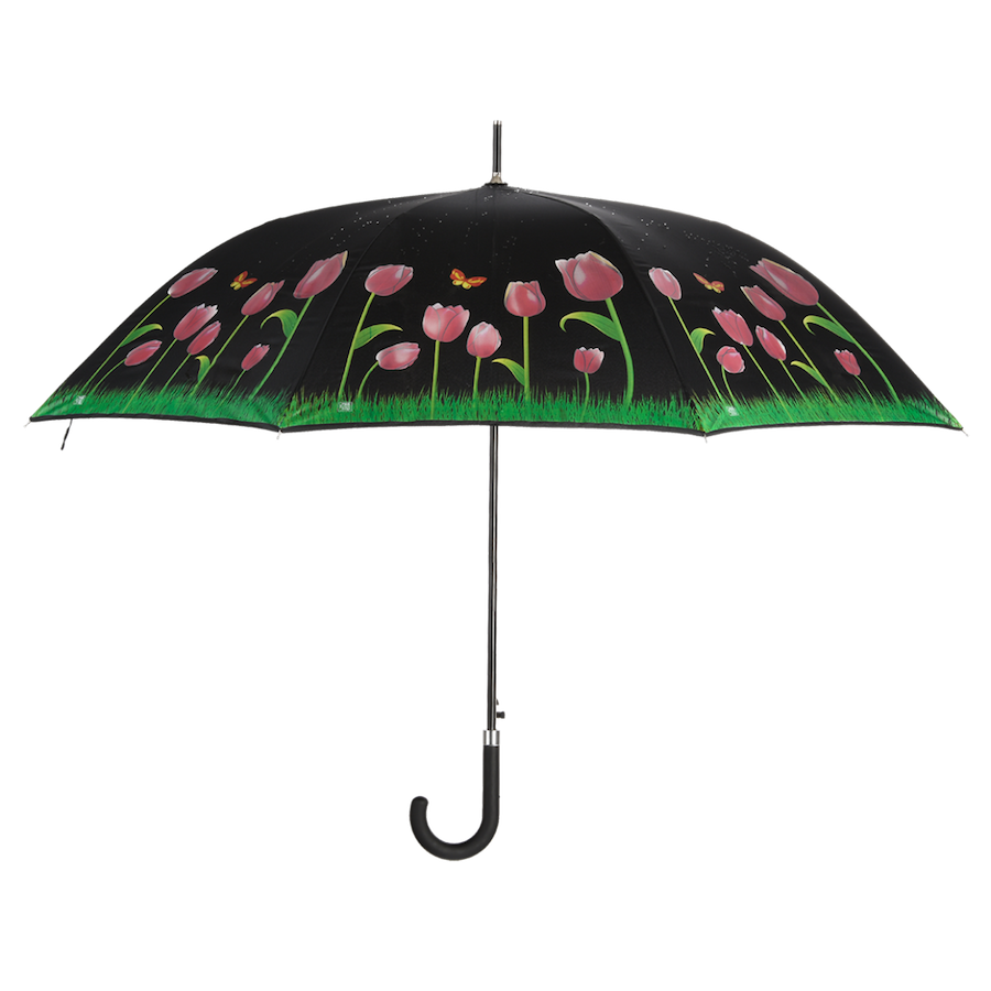 Deze tulpparaplu komt tot leven als het regent. De paraplu heeft een witte bedrukking als het droog is en in de regen verschillende kleuren felgekleurde tulpen.