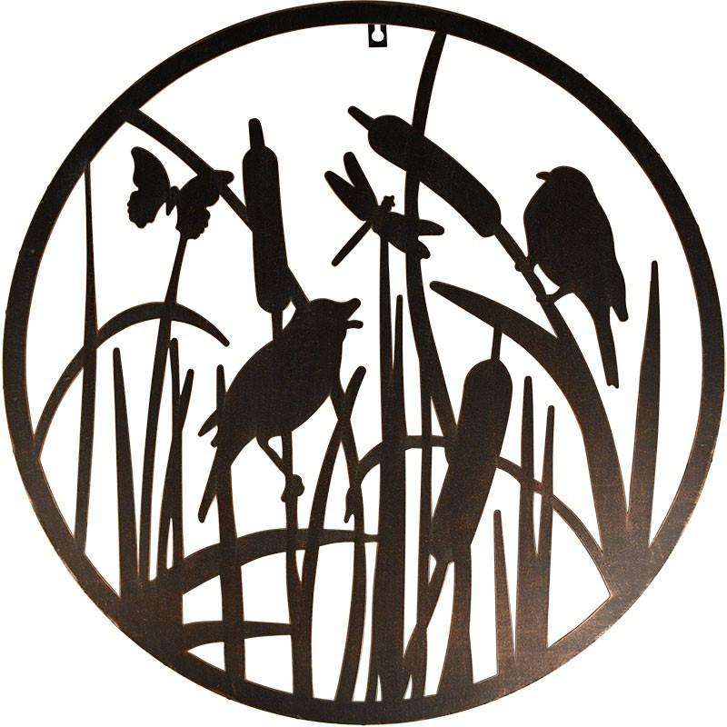 Rond metalen wandobject ter muurdecoratie van uw tuinmuur of tuinschutting van Esschert Design. Dit wandobject heeft een diameter van 60cm en is eenvoudig op te hangen bevestigingsmateriaal niet meegeleverd. Er worden diverse vogels afgebeeld met een vlinder en grassen Diameter 60cm Hoogwaardig staal