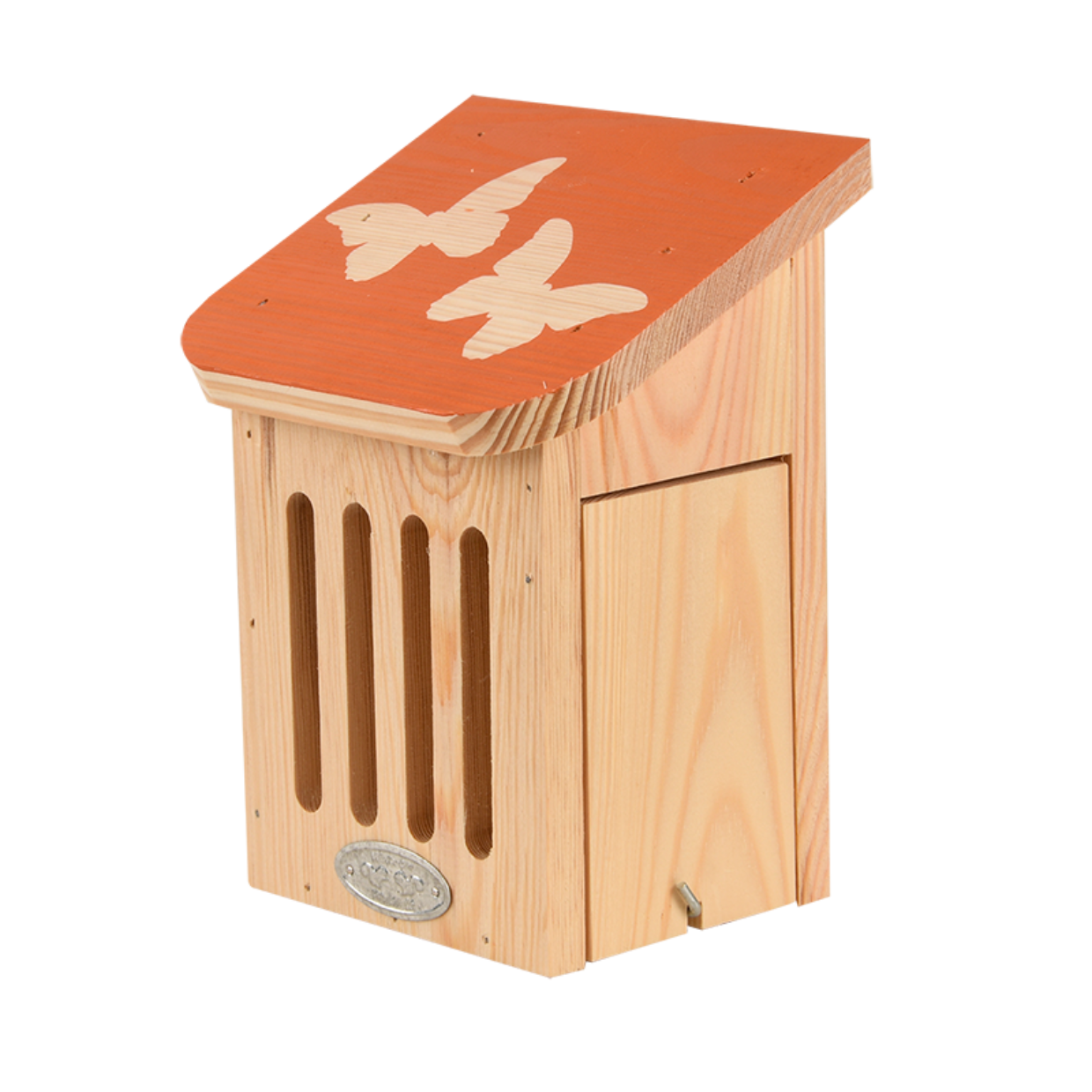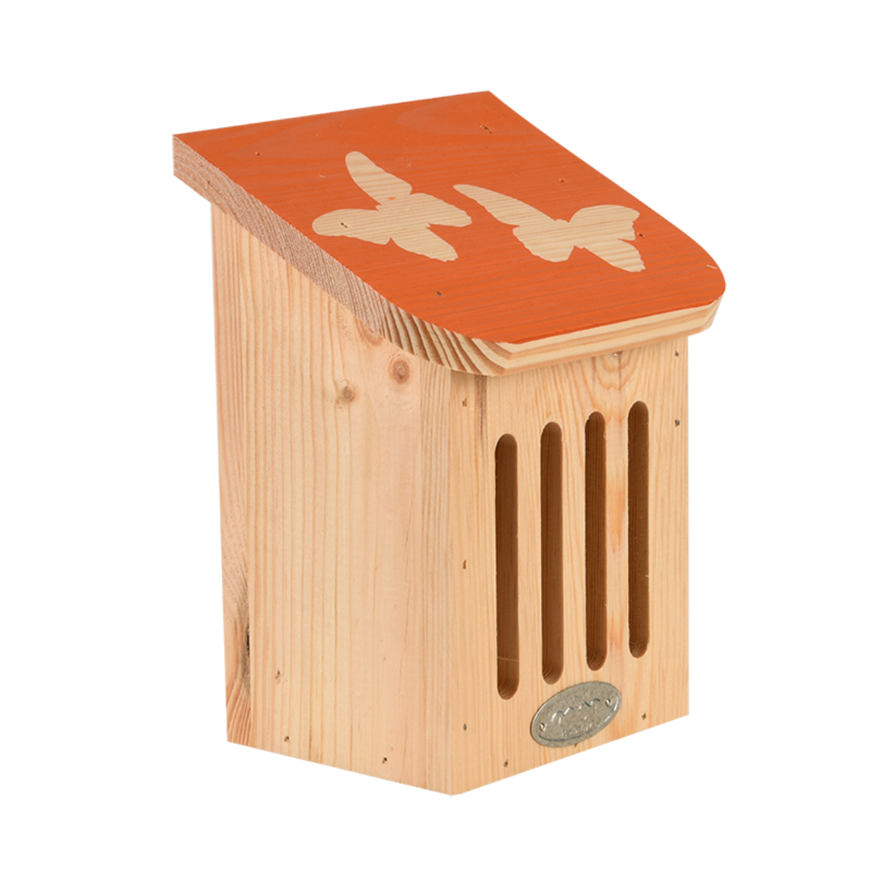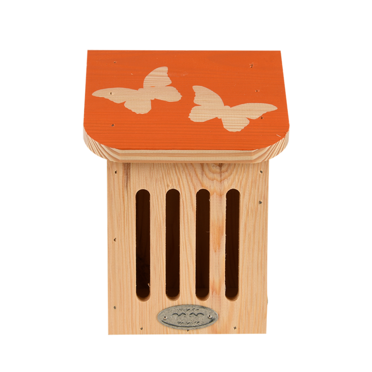 Op een mooie warme en zonnige zomerdag zie je overal vlinders vliegen. Op koude en natte dagen houden ze zich liever schuil. Deze kast biedt vlinders een ideale schuilplaats om bij slecht weer in weg te kruipen. Daarnaast gebruiken vlinders de kast om in te overwinteren. Om het de vlinders helemaal naar de zin te maken, kun je een handvol twijgen in de kast plaatsen zodat de vlinders daaraan kunnen hangen als zij van de kast gebruik maken.