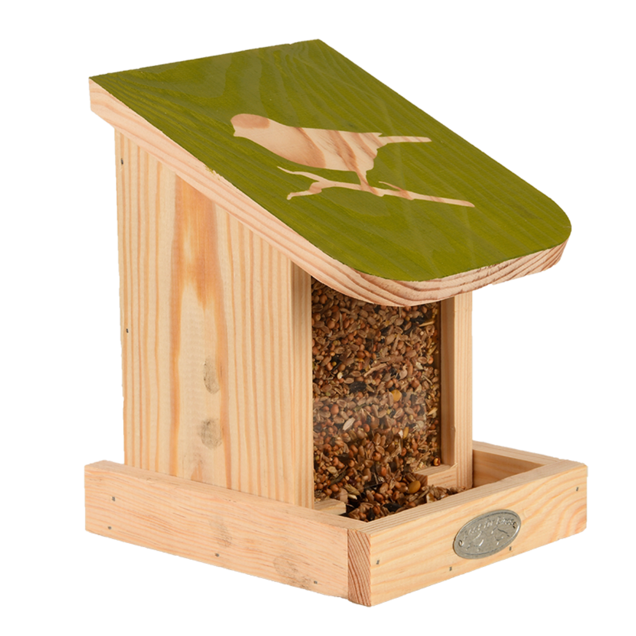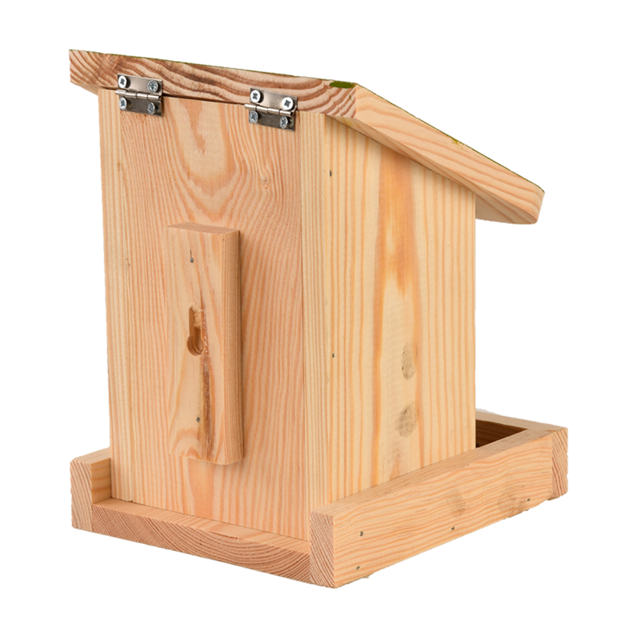 Deze functionele voederhuis heeft een aantal praktische eigenschappen. (Her)vullen gaat eenvoudig door het dak op te tillen. De opstaande rand fungeert als zitstok, waardoor er een aparte voerbak ontstaat. Zo wordt de kans op ziektes verkleind.