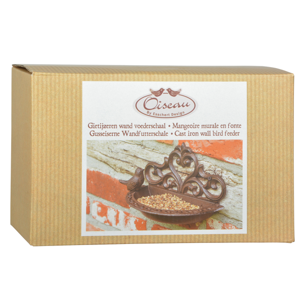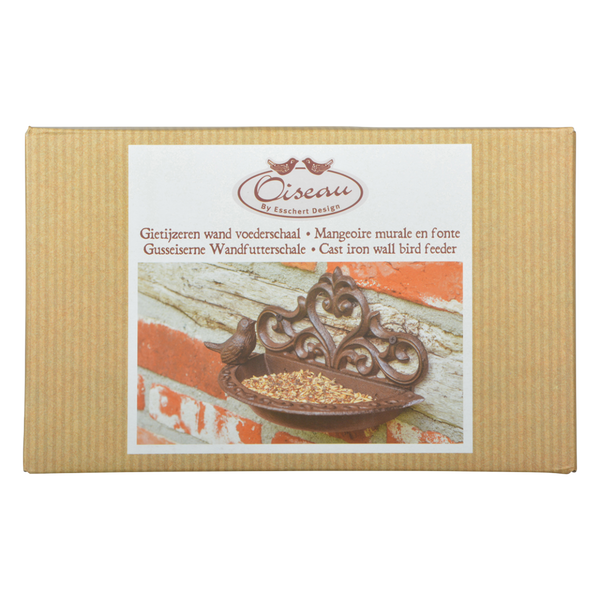 Vogels vliegen in de lucht, zwemmen in de zee en lopen op de aarde. Er heeft al een vogel plaatsgenomen op deze wandvoederschaal die vogels een fijne voederplaats biedt. Het is aan andere vogels om dit voorbeeld zo snel mogelijk te volgen. Door de open structuur kunnen de vogels makkelijk aanvliegen en zo plaatsnemen op het voederplateau. Dankzij de platte sierlijke achterkant met ophangmogelijkheid, kan dit voederhuis tegen de muur opgehangen worden. De gietijzeren schaal is met de hand gegoten volgens eeuwenoud vakmanschap en traditie.• platte achterkant voor muurbevestiging• exclusief muurbeslag• verpakt in full colour giftbox
