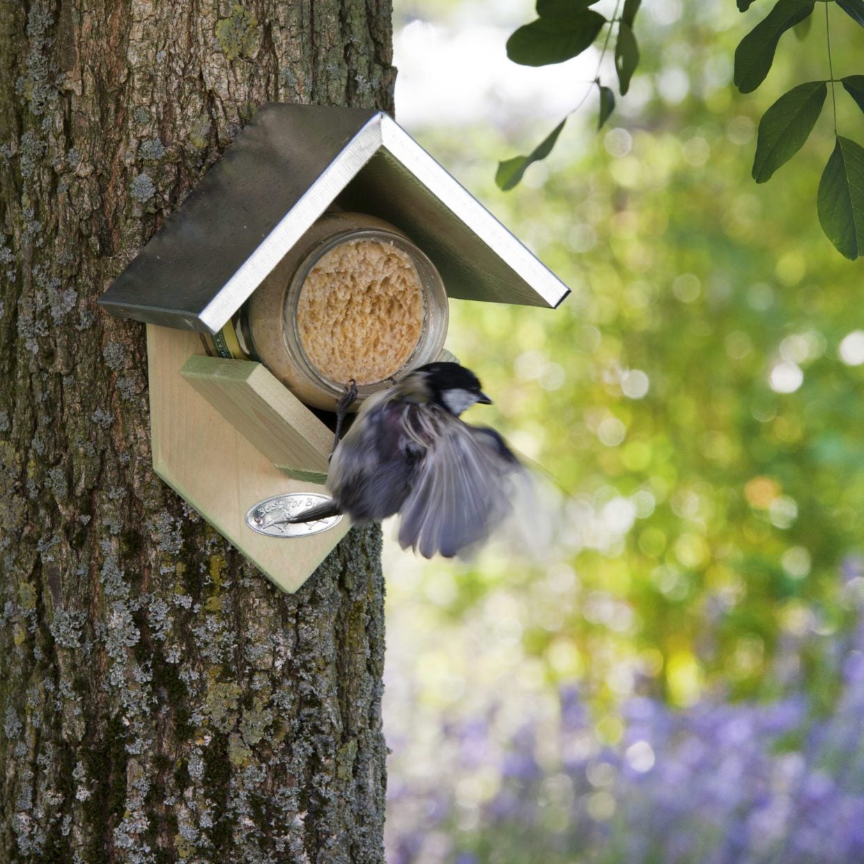Vogelpindakaas is voor onze gevleugelde vrienden een ware lekkernij! In geen enkele tuin mag een pindakaashouder ontbreken. Deze basic houder met zinken dak en pure materialen biedt de mogelijkheid om een pindakaaspot te plaatsen. Met dit voederartikel worden acrobatische vogels aangetrokken zoals: Mezen, Mussen, Boomklevers en Spechten.