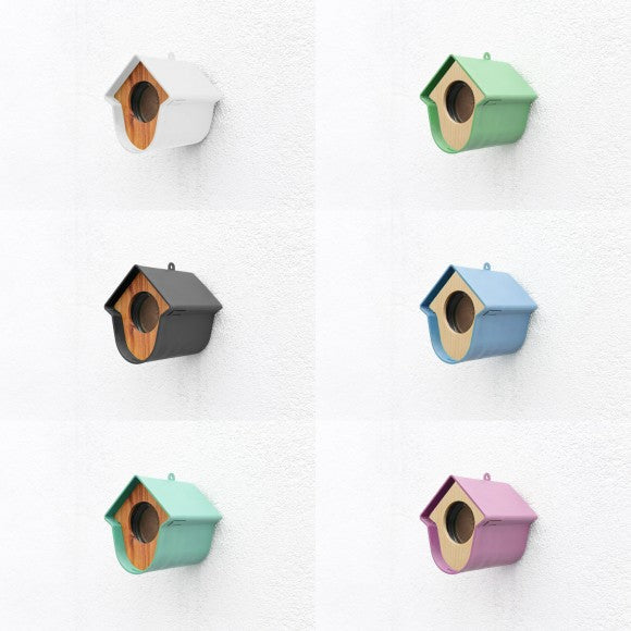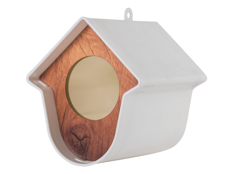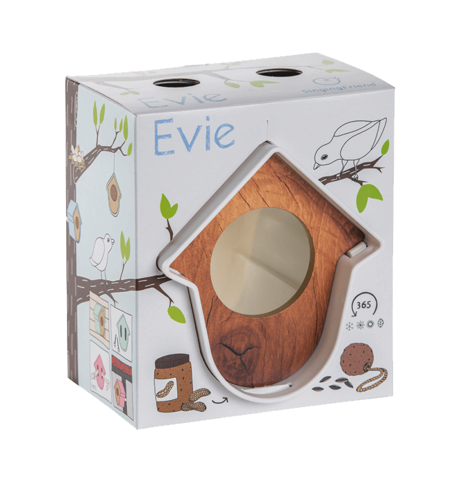 “Hallo, ik ben Evie!” Graag vertel ik iets over mezelf.Ik ben een pindakaaspothouder, maar dan net even anders. De vogels zijn dol op mij als er iets lekkers in me ligt. Zowel grote als kleine potten kun je in me kwijt door simpelweg het houten frontje te verwijderen, de pot erin te leggen en het frontje er weer op te drukken. De vogels help je het meest als je speciale vogelpindakaas voor me haalt. Gewone pindakaas is veel te zout. Maar je kunt ook ander voedsel voor vogels in me leggen. Denk aan een vetbol, pinda’s of zonnepitten. Zelfs een halve appel leg je snel en makkelijk in mij.Wat ook heel handig is aan mij is dat je me op heel veel plekken in je tuin of balkon kan hangen. Door middel van het bijgeleverde klittenband of met een schroef bevestig je me makkelijk aan bijvoorbeeld een regenpijp, horizontale- of verticale schutting of een muur. Maar je kan ook een ander leuk plekje voor me uitkiezen, want ik pas bijna overal. Eerlijk gezegd vind ik dat ik er best leuk uitzie. Ik heb mooie lijnen en je kunt ook nog eens kiezen in welke kleur je me wilt. Ik ben er in maar liefst 6 verschillende kleuren. Zo kan je de kleur kiezen die het beste bij je past. Evie, dat is mijn naam. Niet vergeten hè!