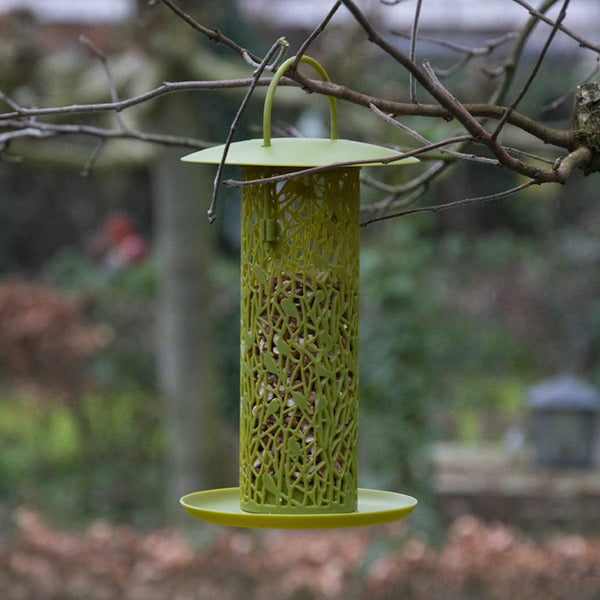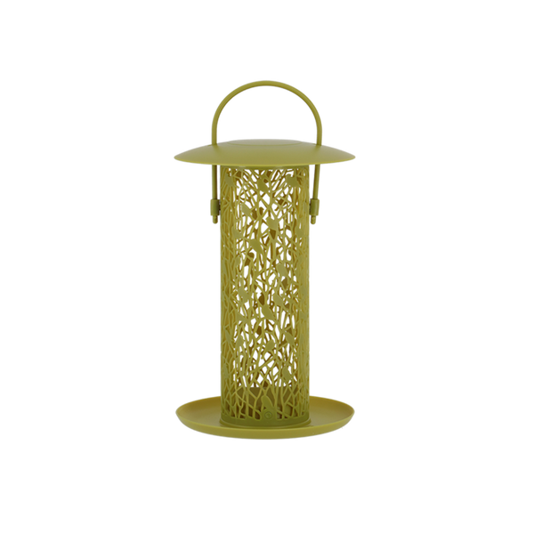 Deze notensilo met tray in trendy groen heeft een open structuur zodat de vogels gemakkelijk van het voer kunnen genieten. Door het deksel omhoog te schuiven is de silo eenvoudig te vullen en door de grote haak gemakkelijk op te hangen.