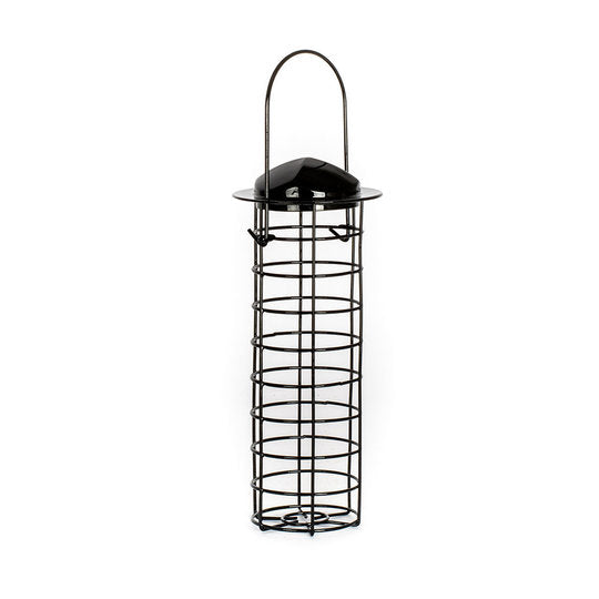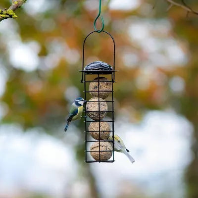 Een vetbolhouder, daar heb je heel veel aan! Zowel mezenbollen als vetbollen kunnen in deze vetbolhouder en wel 4 stuks. De vogels kunnen gemakkelijk bij de bollen komen door de openingen. De zwarte uitrusting maakt het extra hip!