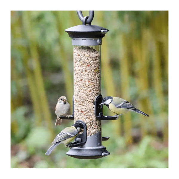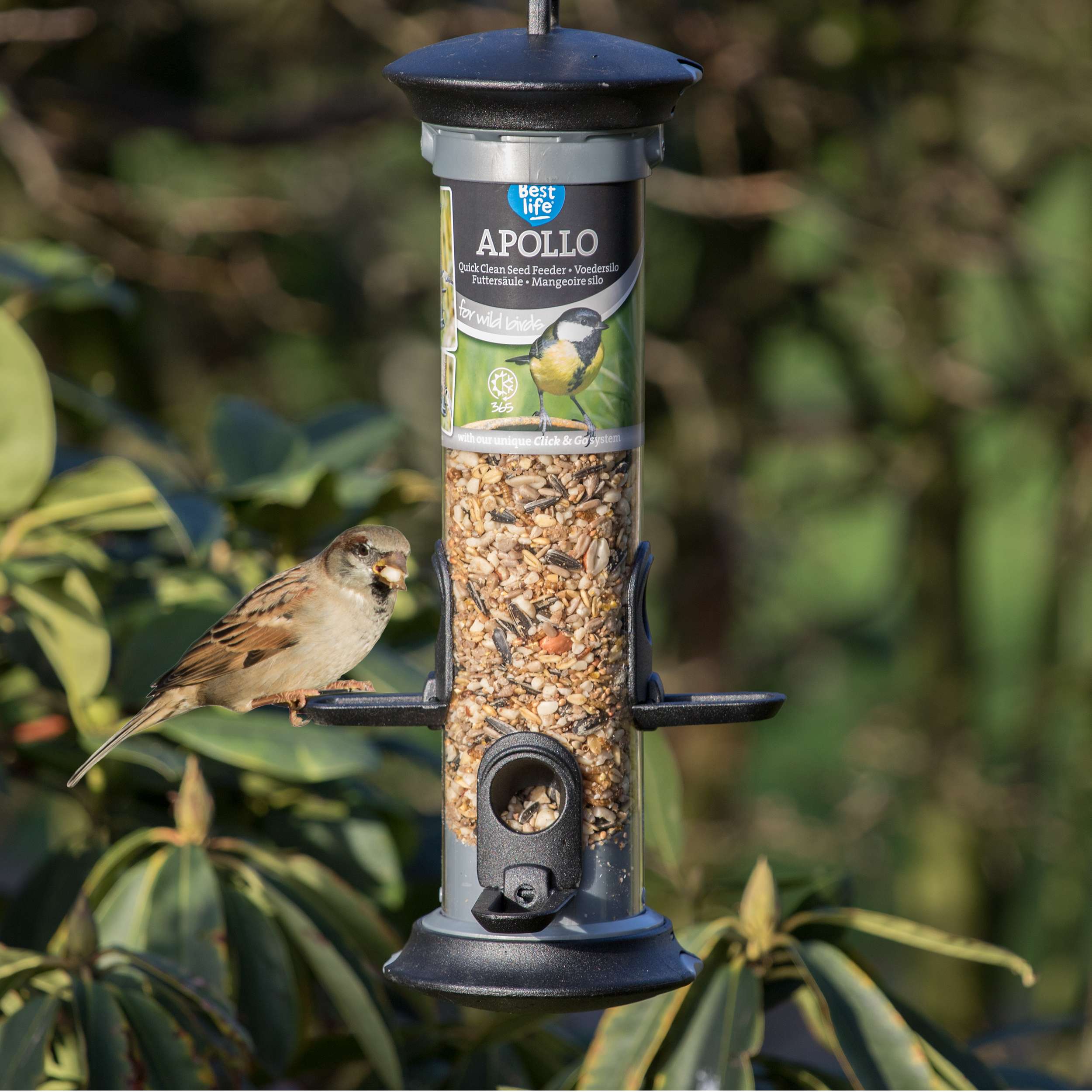 Voedersilo Apollo is speciaal ontworpen om tuinvogels op een comfortabele en vooral veilige manier te voeren. De vier zitringen zorgen ervoor dat de vogels vanuit een natuurlijke houding (voorwaarts) kunnen eten. De afstand tussen de openingen zorgt er voor dat de vogels op voldoende afstand uit elkaar zitten, waardoor ze rustiger kunnen eten.