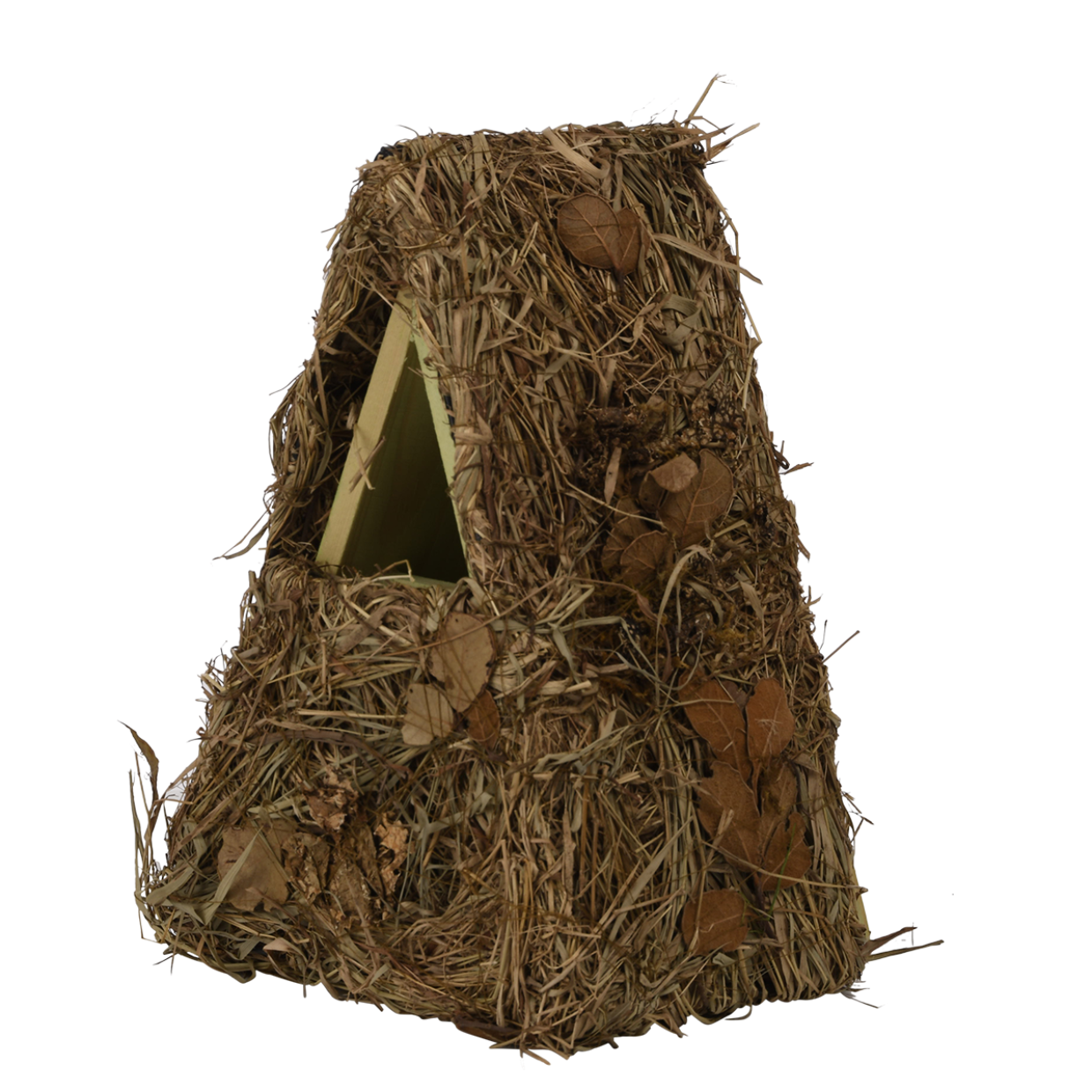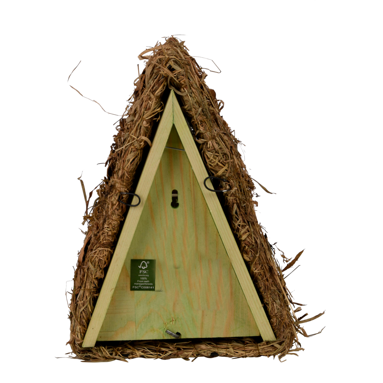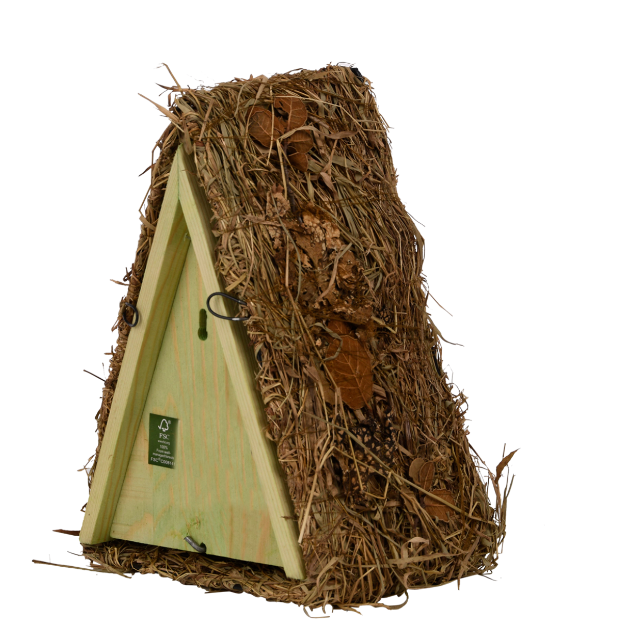 Camouflage nestkast. Deze nestkast is geschikt voor de winterkoning. Plaats de nestkast aan een boom of muur, op een hoogte tot max. 2 m, op een goed verborgen plek tussen dicht struikgewas of klimopplanten, op een rustige en enigszins beschutte plaats, dus niet pal in de zon of op de regenzijde, met een vrije aanvliegroute voor de vogel. In de winter bewijst de kast vaak goede diensten voor de vogels om te schuilen tegen het barre weer.