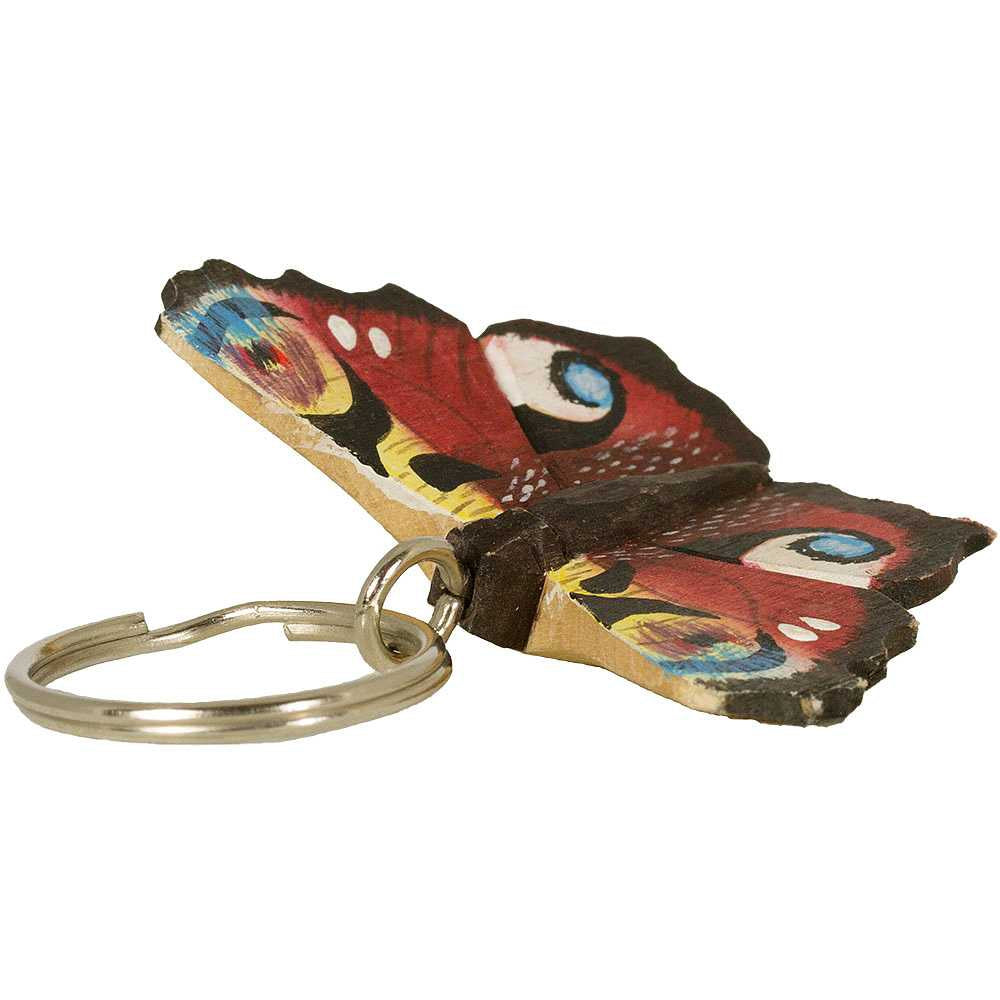 Ein lustiger und praktischer Schlüsselanhänger, der Ihnen hilft, Ihre Schlüssel übersichtlich zu halten. Der Schmetterling ist aus einem Stück Holz handgeschnitzt und mit umweltfreundlichen Farben handbemalt. Er ist an einem Metallring befestigt.