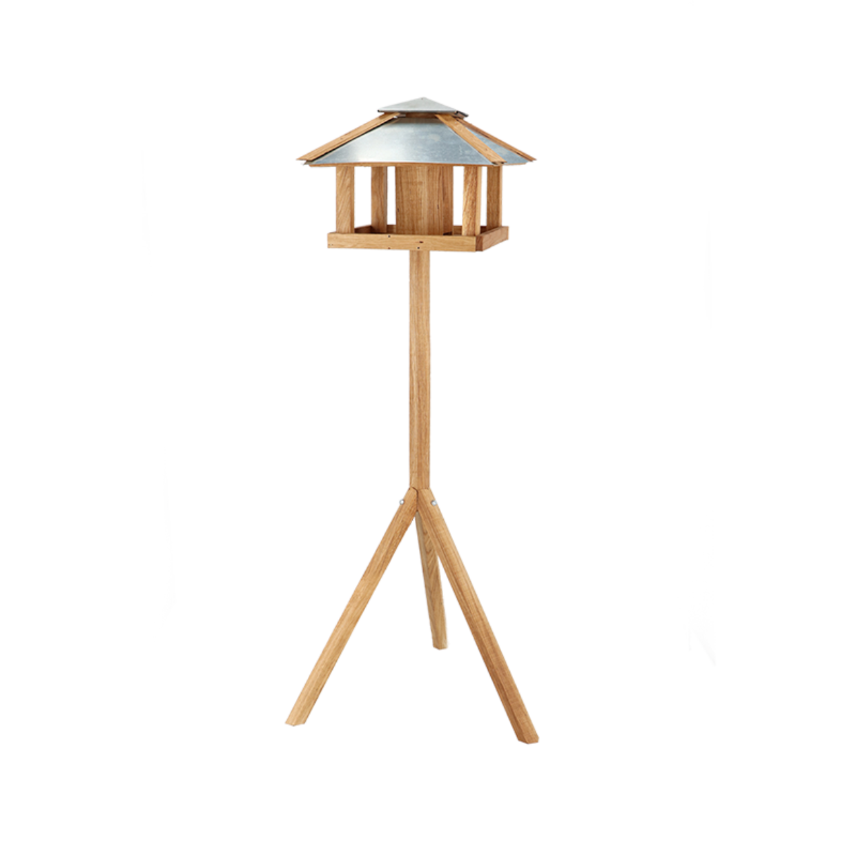 Dieser quadratische Futtertisch ist mit einem Futtersilo ausgestattet, hat ein Stahldach und ist aus Eiche gefertigt. Das Futtersilo dosiert das Futter und hält es trocken. Der Futtertisch wird inklusive Untergestell geliefert.