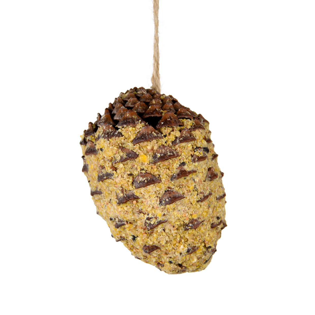 Locken Sie Vögel mit diesem gefüllten Tannenzapfen in den Garten. Inklusive Kordel, einfach aufzuhängen. Fettreiches Winterfutter. Extra Energie. 330 gr