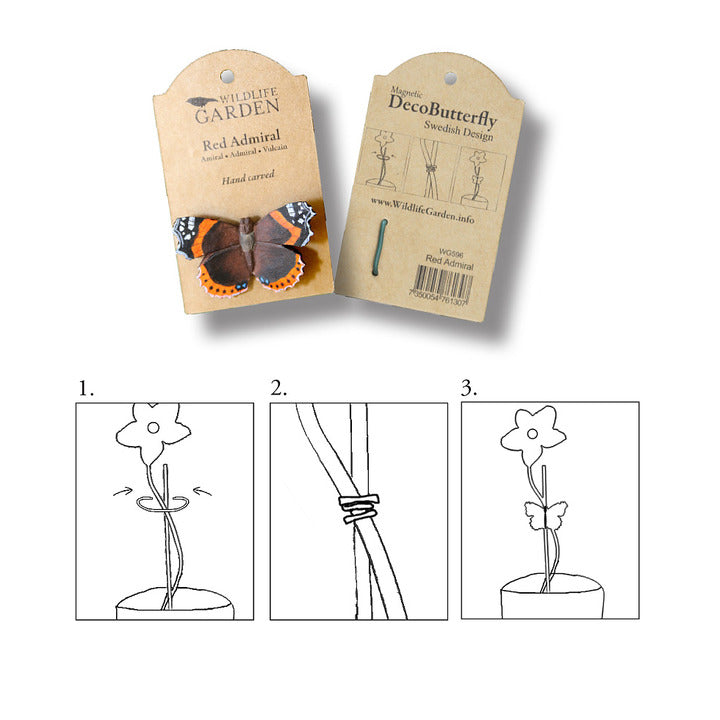 Die handgefertigten Schmetterlinge von Wildlife Garden können sowohl im Innen- als auch im Außenbereich zur Dekoration verwendet werden. Dank des Magneten auf der Rückseite können die Schmetterlinge beispielsweise als Kühlschrankmagnete verwendet werden. Mit dem mitgelieferten Draht können die Schmetterlinge auch zum Dekorieren von Blumen und/oder Pflanzen verwendet werden. Beim Admiral könnte man auf den ersten Blick einen echten Schmetterling vermuten, der jeden Moment zur nächsten Blüte davonfliegen könnte. Unsere Schmetterlinge verschönern Ihre Pflanzen, auch wenn sie nicht blühen. Die DekoSchmetterlinge sind ein schönes Geschenk für Sie selbst oder andere. Die Schmetterlinge werden in Handarbeit aus Lindenholz gefertigt und von Hand bemalt. Die verwendete Farbe ist selbstverständlich umweltfreundlich. Die Kollektion besteht derzeit aus folgenden bekannten europäischen Schmetterlingen: C-Falter, Tagpfauenauge, Ciron-Falter, Trauermantel, Stechpalmen-Bläuling, Admiral und Königinnen-Page.