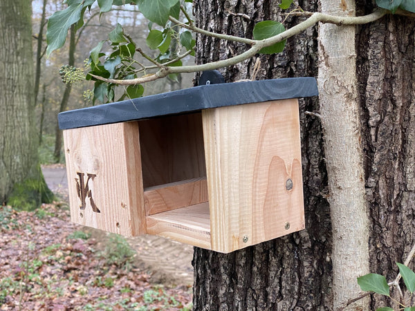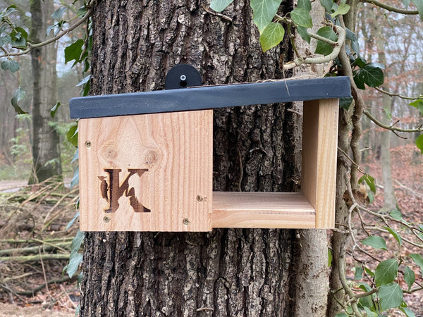 KOOPRIJK - Rotkehlchen-Nistkasten Dieser schöne und besonders stabile Nistkasten mit offener Konstruktion und Balkon ist speziell für Halbhöhlenbrüter konzipiert. Der Nistkasten wird insbesondere vom Rotkehlchen, gelegentlich aber auch vom Gartenrotschwanz, Trauerschnäpper und der Bachstelze besucht. Aber auch die Amsel oder andere Luxusvögel, die einen Balkon bevorzugen, bauen manchmal ein Nest in diesem Vogelhäuschen. Aus massivem, hochwertigem Douglasienholz, wasserdicht lackiertes Dach. Platzierung: Mindestens 1,8 m über dem Boden aufhängen, nicht in der prallen Sonne und geschützt vor Schlagregen. Die Nistkästen der Serie KOOPRIJK werden mit viel Liebe von Hand gefertigt und sind ein ehrliches, original Achterhoek-Produkt. Aus hochwertigem Holz gefertigt, verschraubt statt genietet, damit sich dieser Nistkasten nicht nach einem Jahr in ein Insektenhotel auf dem Boden verwandelt. Interessiert an den anderen Kastentypen der Serie KOOPRIJK? Beachten Sie die grauen Dächer und das einzigartige Brandzeichen.
