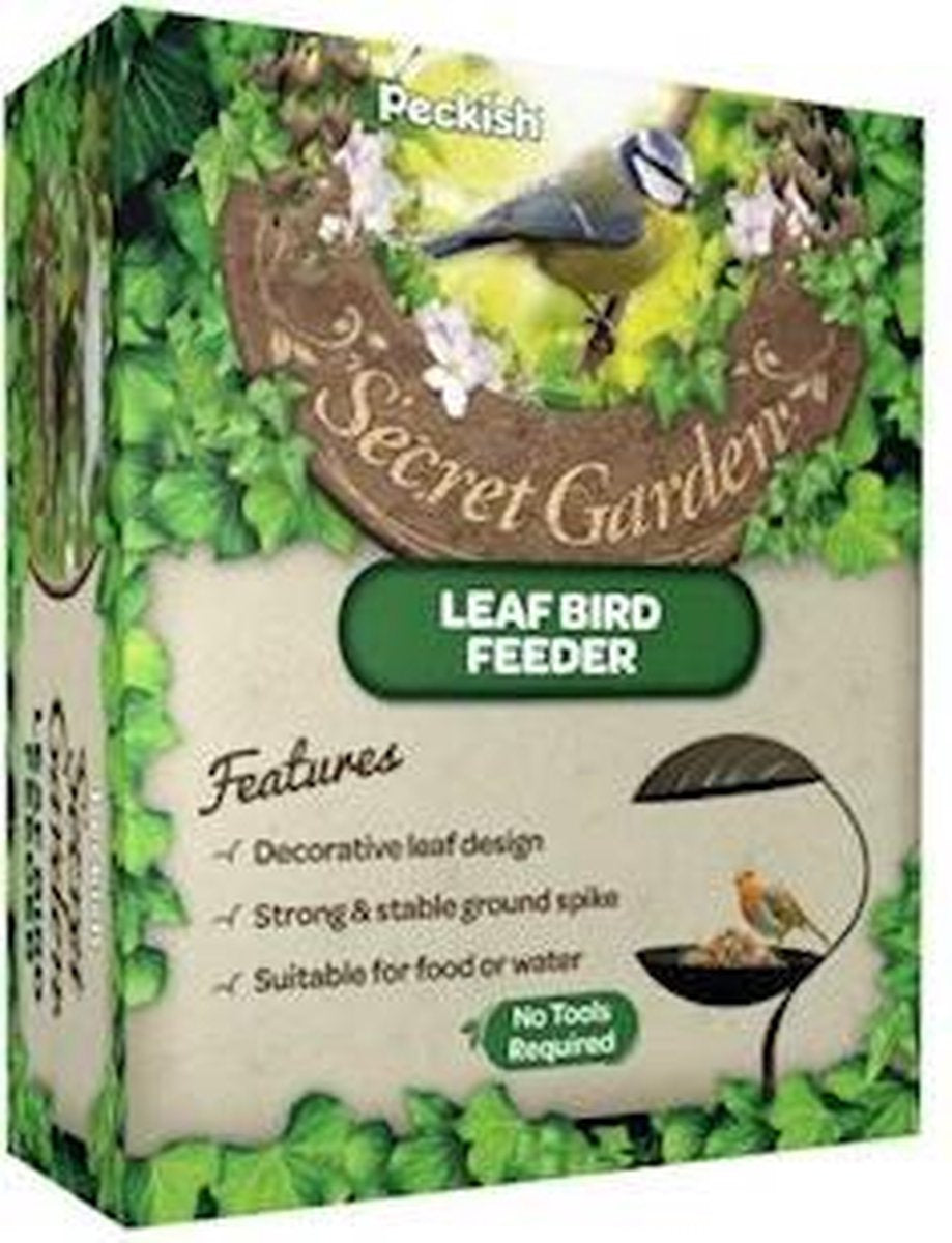 Schöner Futterspender zum Einstecken. Stabiler Metallfutterspender mit dekorativen Blättern, einem Blatt zum Einfüllen von Futter oder Wasser und einem Blatt als Dach. Der Futterspender ist 80 cm hoch.