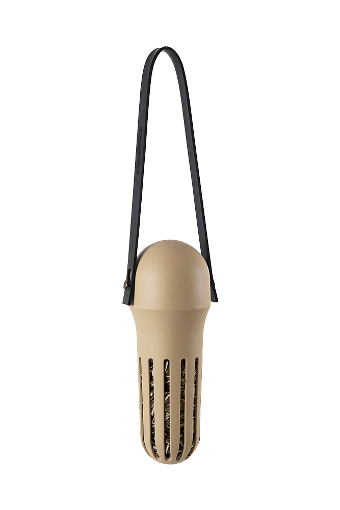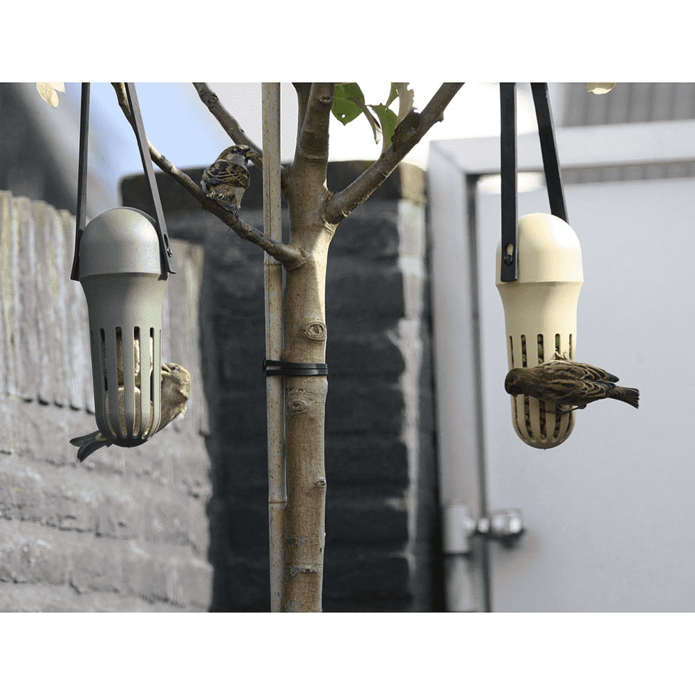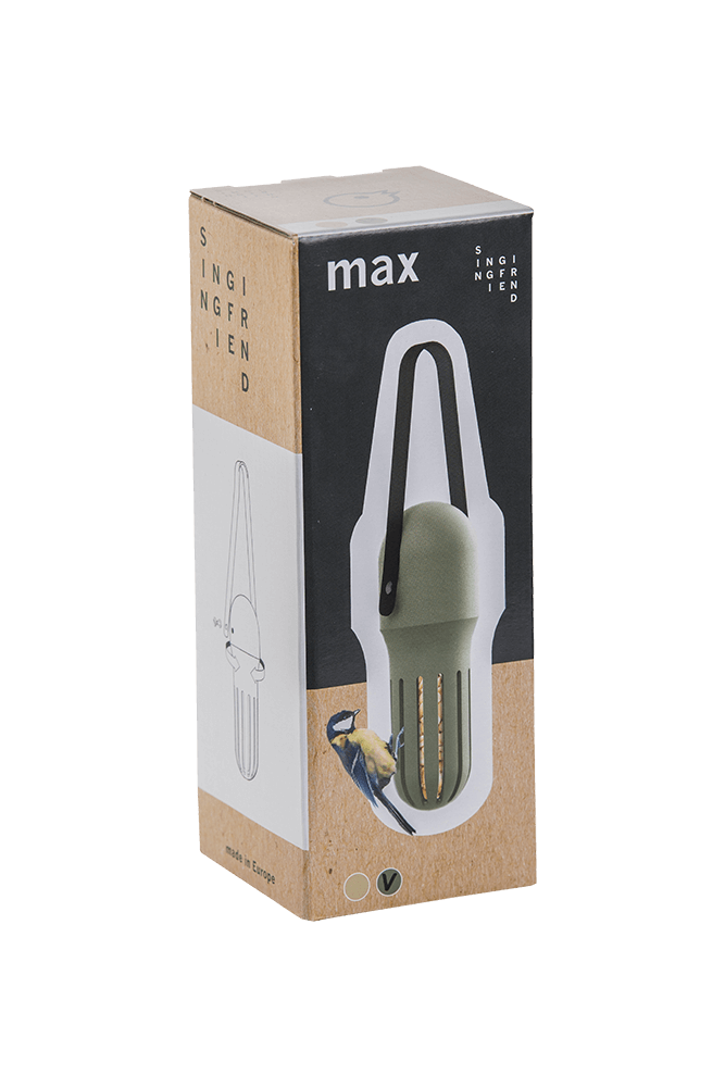 Max is fast and easy to refill. With the strong strap you can hang the product in the garden or on the balcony. Refilling is easy; unscrew the bottom part and fill the reservoir with bird food. Max is stylish and practical. Due to the shape of the slots, only small birds can eat from the feeder.