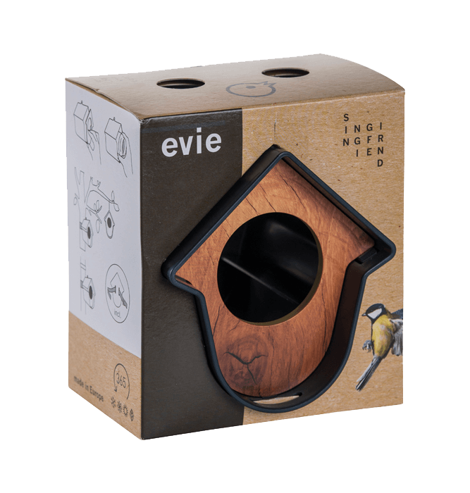 “Hello, I’m Evie!” I’d like to tell you something about myself. I’m a peanut butter jar holder, but a little different. The birds love me when there’s something tasty in me. You can put both large and small jars in me by simply removing the wooden front, putting the jar in and pressing the front back on. You’ll help the birds the most if you get special bird peanut butter for me. Regular peanut butter is way too salty. But you can also put other bird food in me. Think of a fat ball, peanuts or sunflower seeds. You can even put half an apple in me quickly and easily. What’s also very handy about me is that you can hang me in many places in your garden or on your balcony. By means of the supplied Velcro or with a screw you can easily attach me to, for example, a drainpipe, horizontal or vertical fence or a wall. But you can also choose another nice spot for me, because I fit almost anywhere. To be honest, I think I look quite nice. I have beautiful lines and you can also choose which color you want me in. I come in no less than 6 different colors. So you can choose the color that suits you best. Evie, that's my name. Don't forget!