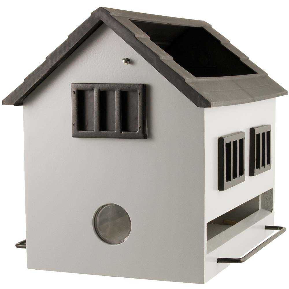 With this stylish grey birdhouse with built-in birdbath, you get a real bird magnet in the garden. This bird feeder is similar to the classic grey house with white windows but with a luxurious twist - a built-in swimming pool! The frost-resistant plastic roof can be easily removed for cleaning or refilling with 2.5 litres of seed. Weight:1.2 kg Quality:Wood, polypropylene plastic Dimensions:240 x 170 x 210 mm Capacity:2.5 l Assembly:On a pole, screws are included pole not included