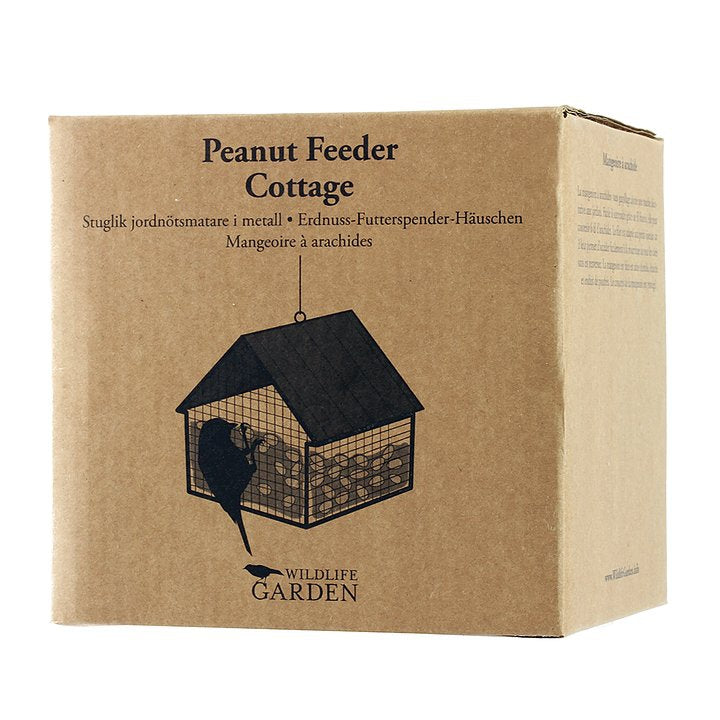 This hanging bird feeder in the shape of a small house is cleverly designed. It is designed for peanuts that are placed in a metal mesh. This reduces the risk of droppings coming into contact with the food. It is designed so that birds can reach the food from all directions, but is not suitable for larger birds. Tits, such as the blue tit, are particularly fond of peanuts. The bird feeder is easy to refill, clean and hang on your balcony, terrace or in the trees in your garden. If the peanuts are packed in plastic, please remember to remove this, as the small birds could otherwise accidentally ingest plastic. Supplement to the bird table The peanut feeder can also be used as a supplement to your bird seed feeder or fat balls. Colour: Black Weight: 0.3 kg Dimensions: 125 x 154 x 137 mm Quality: Powder-coated steel Capacity: 0.6 l Assembly: Hanging cord EAN: 7350054763974