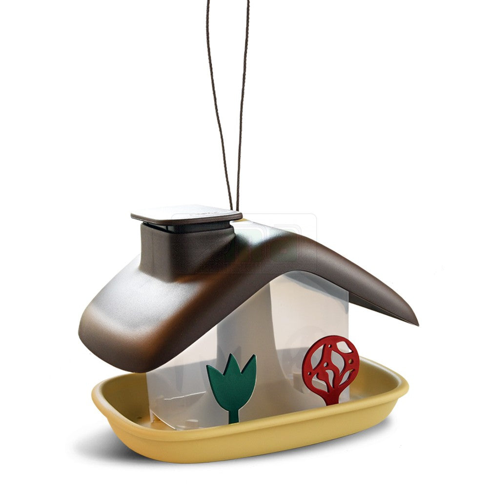 Modern plastic bird feeder that can be hung, stood on a stick or attached to a balcony railing. The food always stays dry thanks to the silo that can be closed off with a roof. The entire house can be dismantled and is therefore easy to clean. The food can be refilled via the chimney.