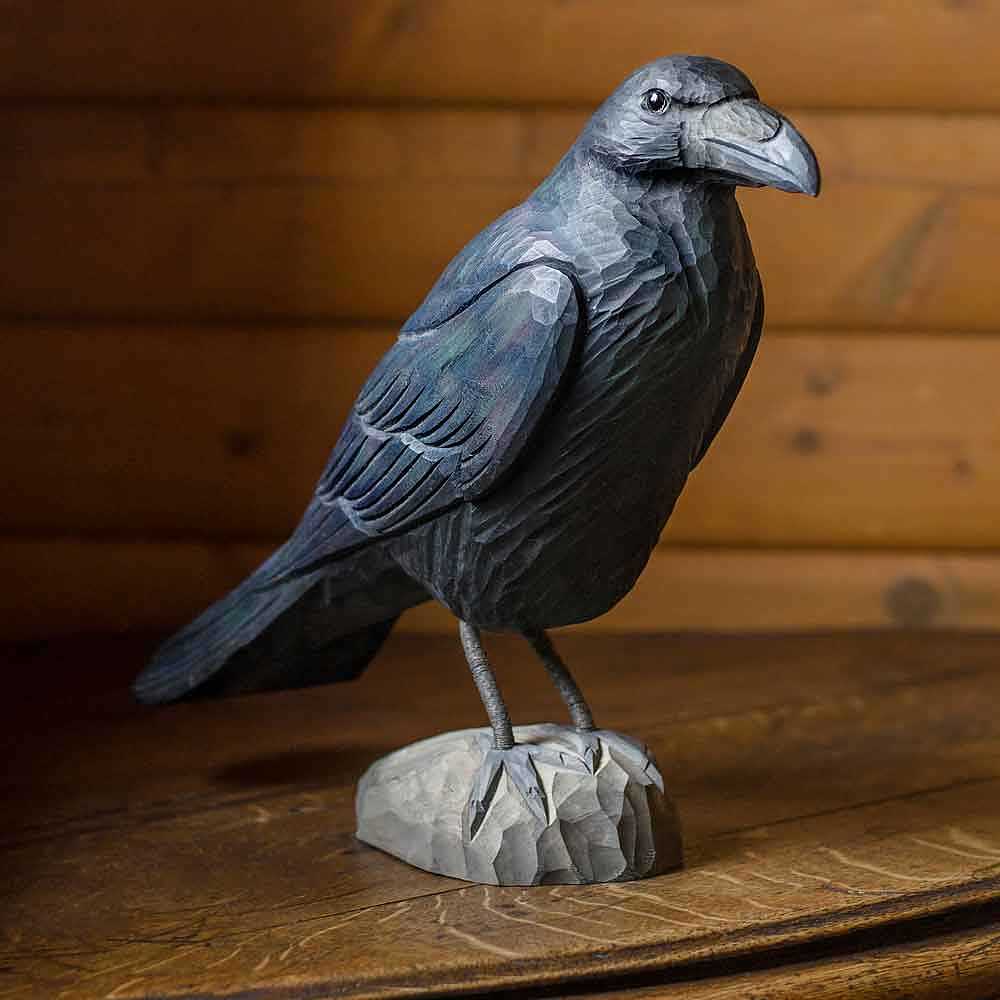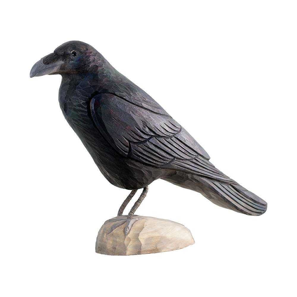 Gehuld in mythe is de raaf lang synoniem geweest voor kwaad, dood en het occulte. Zijn reputatie bestrijkt al eeuwen bijna alle wereldculturen . Deze vakkundig bewerkte houten vogel vangt de raadselachtige uitdrukking van de raaf. De raaf is een schichtige vogel die nestelt in diepe bossen en bergketens met zijn levenslange partner. Het is de grootste van alle trekvogels. Het grote, blauwe, glinsterende lichaam en de diep rollende roep maken hem gemakkelijk te herkennen. Onze DecoBird raaf is met de hand gesneden en met de hand beschilderd met milieuvriendelijke kleurstoffen. Grootte: 34 x 10 x 25 cmlxbxh