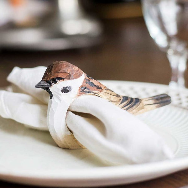 Laat de natuur uw tafel inspireren met een met de hand gesneden mussen servetring. De mus is kleiner en compacter dan de huismus en komt voor in het grootste deel van Europa, maar is ook te vinden in Amerika, Australië en Azië. De vakkundig gesneden servetring is met de hand beschilderd in milieuvriendelijke kleuren, zodat het hele gezin deze trouwe tuinbezoeker kan leren herkennen. Om de best mogelijke kwaliteit van onze producten te behouden, worden onze houten servetringen vakkundig met de hand gesneden en met de hand geschilderd met milieuvriendelijke verf.