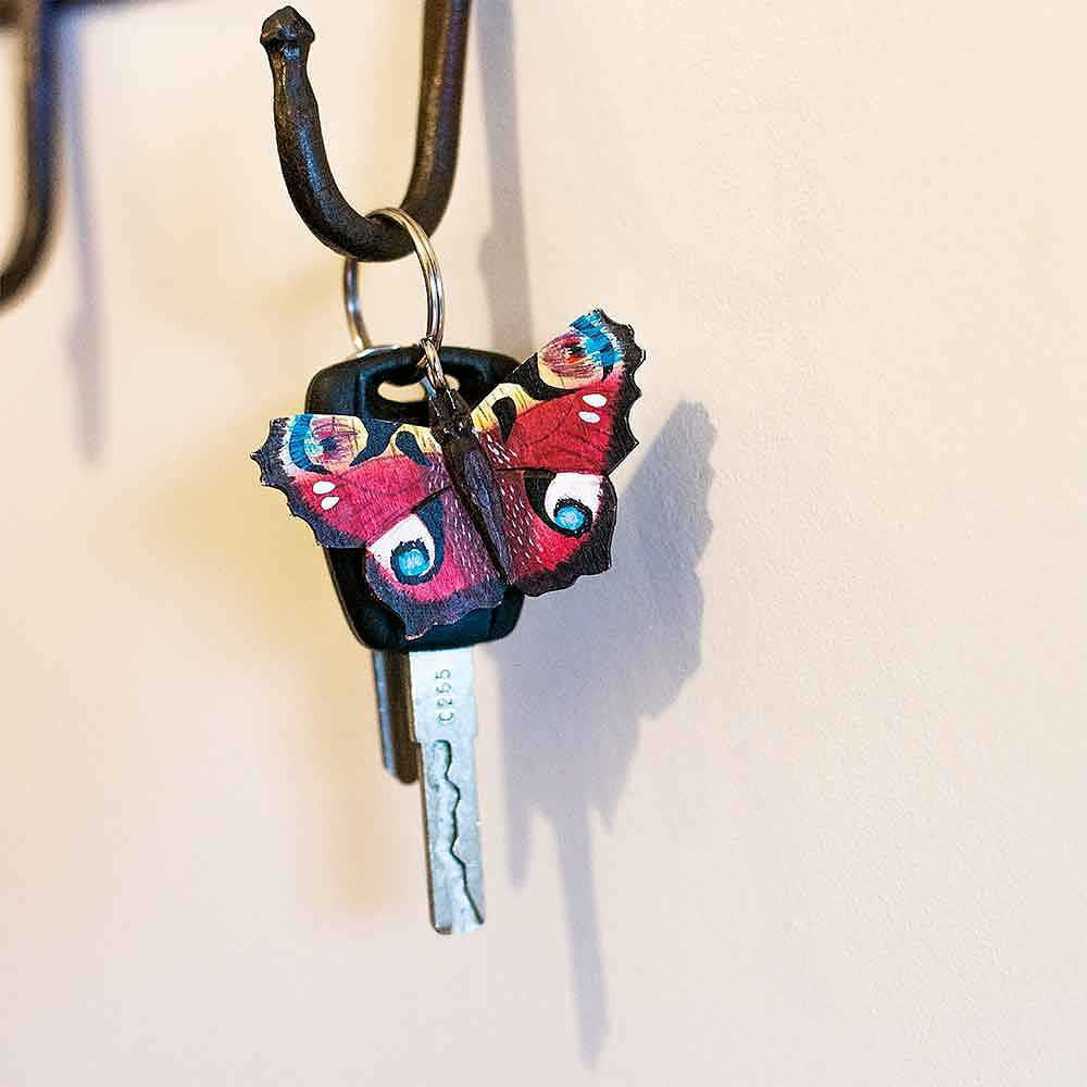 Een leuke en praktische sleutelhanger die helpt uw sleutels te ordenen. De vlinder is met de hand gesneden uit een stuk hout en met de hand beschilderd met uitsluitend milieuvriendelijke verf. Hij is bevestigd aan een metalen ring.
