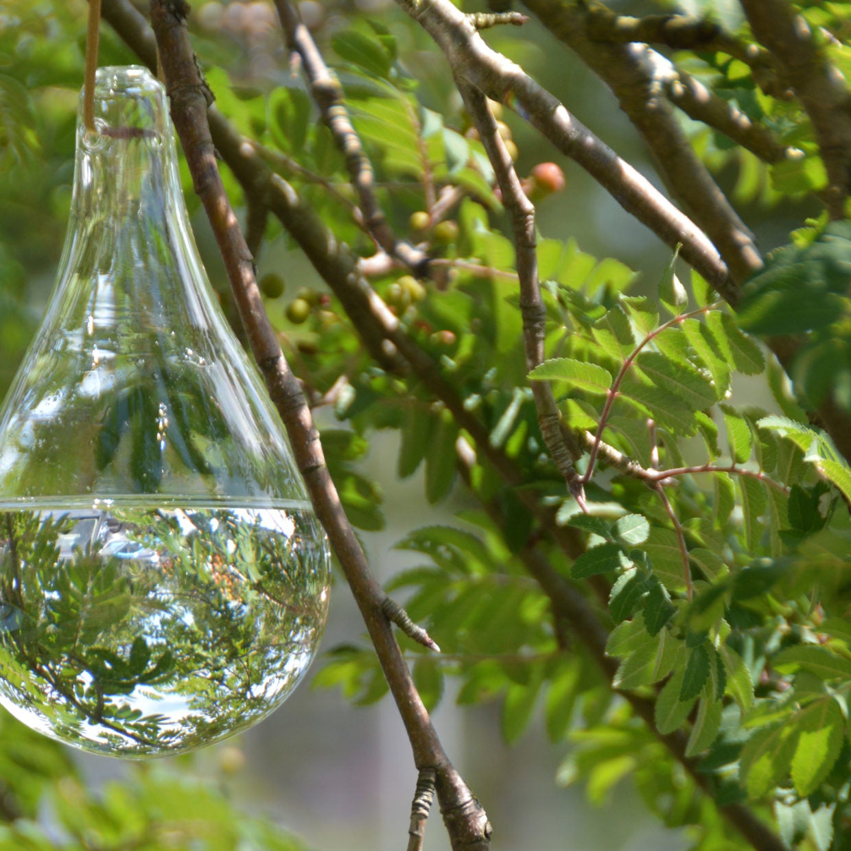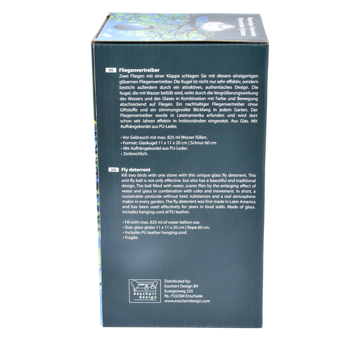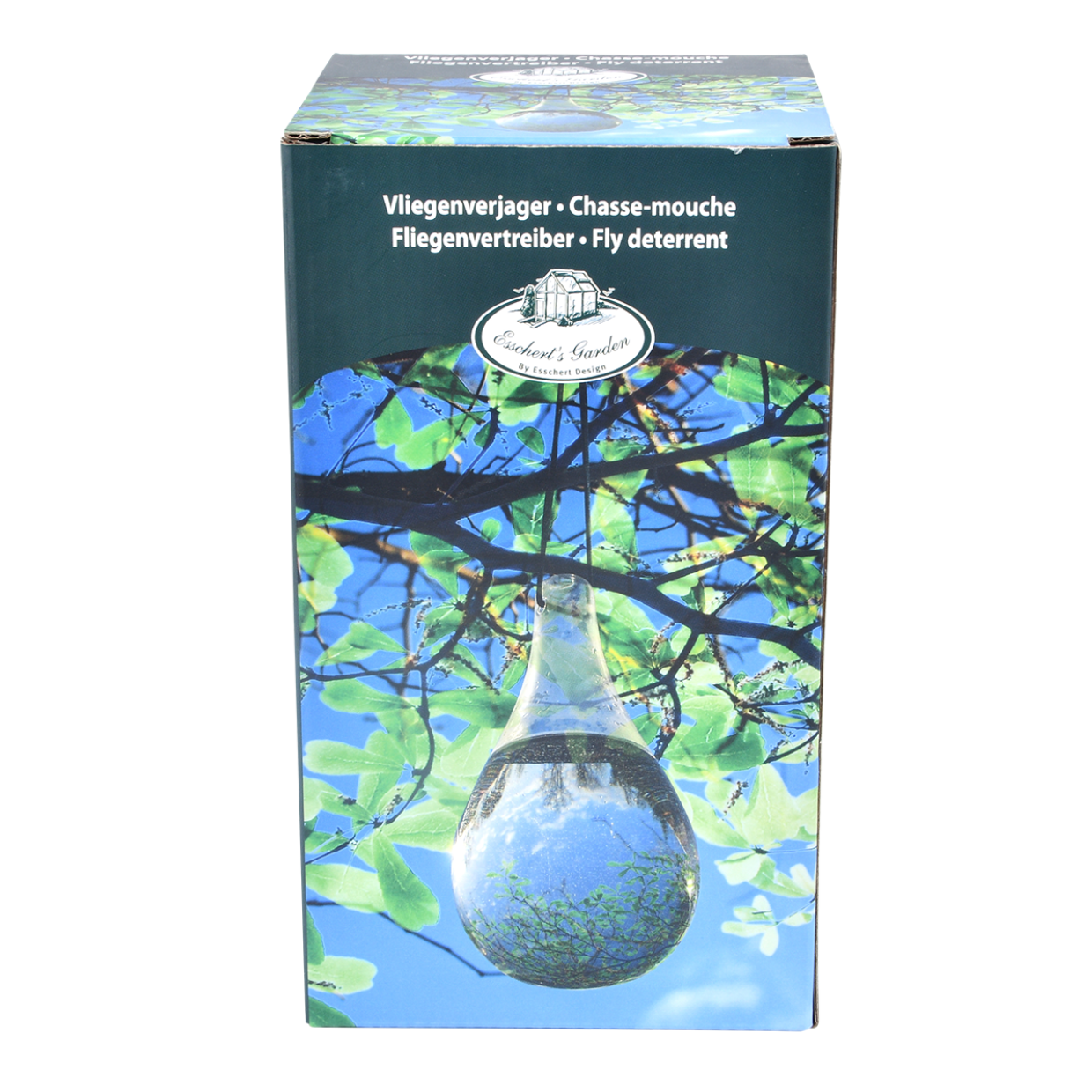 Twee vliegen in één klap met deze unieke glazen vliegenverjager. Deze anti-vlieg bol is nietalleen erg effectief, maar heeft ook een mooi en ambachtelijk design. De met water te vullen bol schrikt vliegen af door de vergrotende werking van water en glas in combinatie met kleur en beweging. Kortom een duurzaam bestrijdingsmiddel zonder giftige stoffen én een echtesfeermaker in iedere tuin. De vliegenverjager is bedacht in Latijns Amerika en wordt al jaren effectief gebruikt in voedselkraampjes.