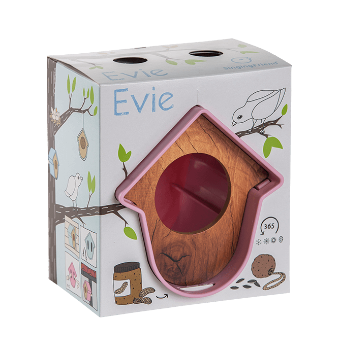 “Hallo, ik ben Evie!” Graag vertel ik iets over mezelf.Ik ben een pindakaaspothouder, maar dan net even anders. De vogels zijn dol op mij als er iets lekkers in me ligt. Zowel grote als kleine potten kun je in me kwijt door simpelweg het houten frontje te verwijderen, de pot erin te leggen en het frontje er weer op te drukken. De vogels help je het meest als je speciale vogelpindakaas voor me haalt. Gewone pindakaas is veel te zout. Maar je kunt ook ander voedsel voor vogels in me leggen. Denk aan een vetbol, pinda’s of zonnepitten. Zelfs een halve appel leg je snel en makkelijk in mij.Wat ook heel handig is aan mij is dat je me op heel veel plekken in je tuin of balkon kan hangen. Door middel van het bijgeleverde klittenband of met een schroef bevestig je me makkelijk aan bijvoorbeeld een regenpijp, horizontale- of verticale schutting of een muur. Maar je kan ook een ander leuk plekje voor me uitkiezen, want ik pas bijna overal. Eerlijk gezegd vind ik dat ik er best leuk uitzie. Ik heb mooie lijnen en je kunt ook nog eens kiezen in welke kleur je me wilt. Ik ben er in maar liefst 6 verschillende kleuren. Zo kan je de kleur kiezen die het beste bij je past. Evie, dat is mijn naam. Niet vergeten hè!