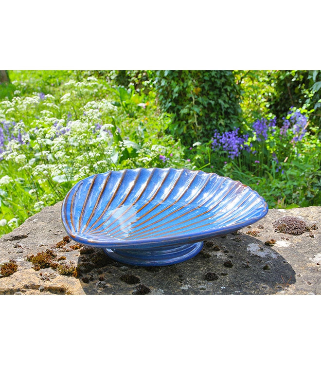 Het schelp vogelbad biedt vogels, en andere tuindieren als bijen, een prachtige plek om te baden en te drinken. Ontworpen in een klassieke schelpvorm in prachtig azuurblauw. De schaalruggen piepen door in terracotta kleur en helpen om een