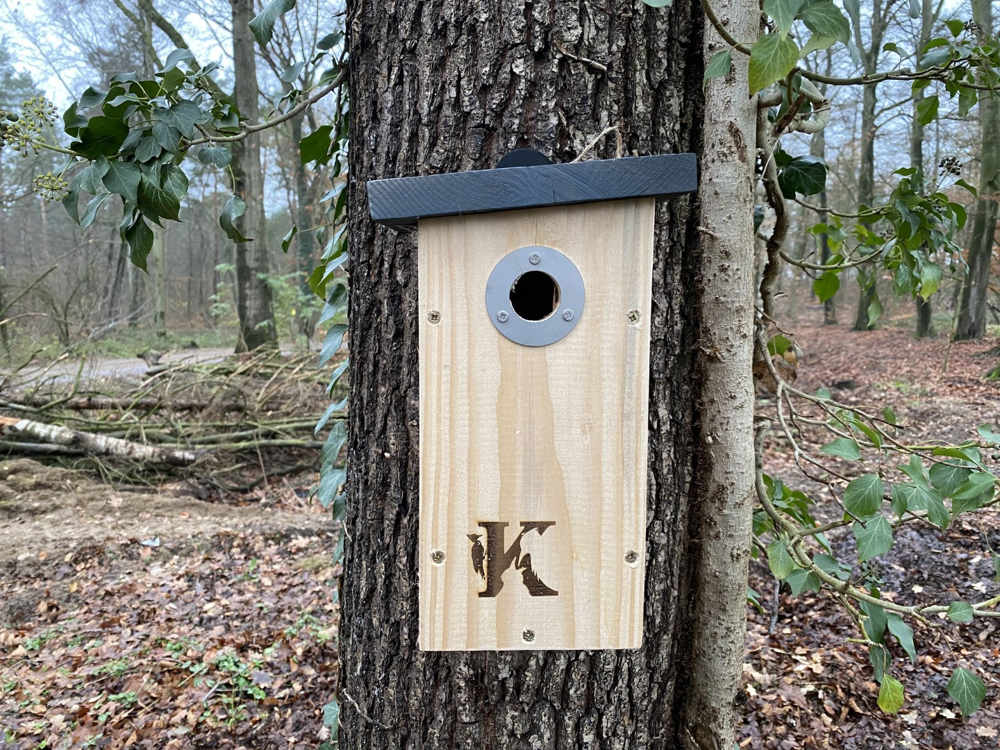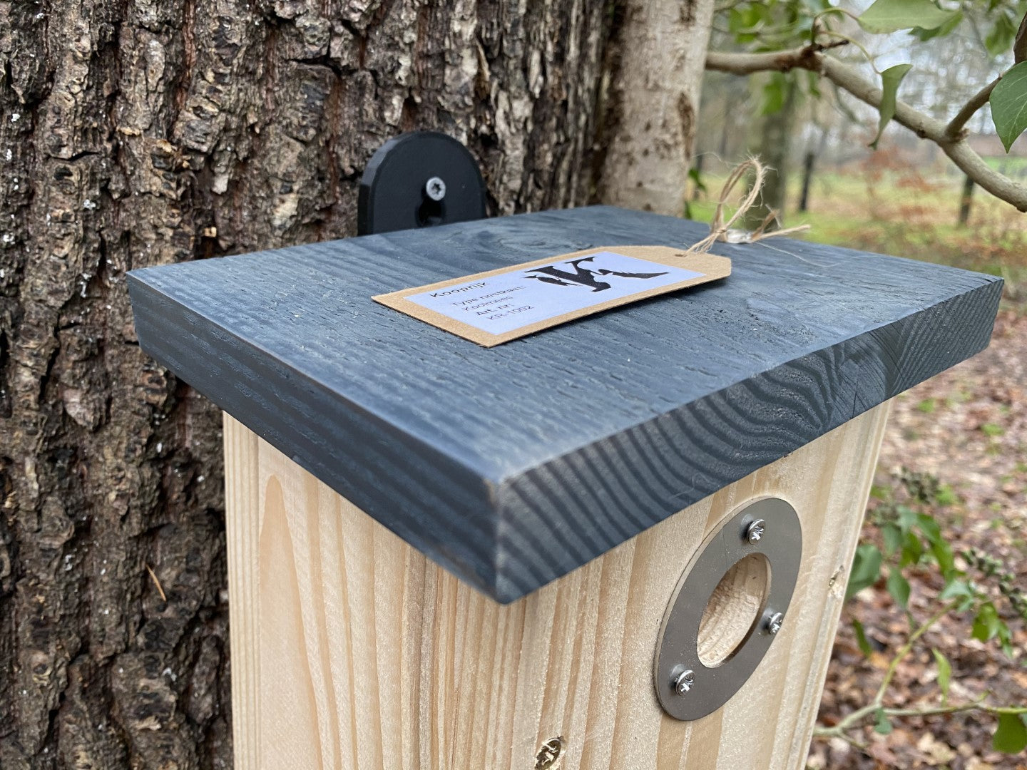 KOOPRIJK - Koolmees nestkast In deze fraaie roofvogel bestendige nestkast zullen in het bijzonder de koolmees zich thuisvoelen vanwege de 32mm vliegopening, incidenteel wil een pimpelmees zich ook gaan nestellen in deze kasten. Vervaardigd uit massief hoogwaardig douglas hout, gelakt waterdicht dakje en voorzien van een anti roofvogel invliegring spechten willen de opening van een nestkast nog wel eens groter maken om toegang te verschaffen. Deze invliegring en de scharnieren van deze kast zijn uit RVS roest vrij staal vervaardigd zodat deze ook na meerdere jaren geen roest vertoont. Plaatsing: Op minimaal 1,8 m van de grond af ophangen en minimaal 10 meter van eenzelfde soort nestkast ophangen. Niet in volle zon ophangen en bij voorkeur aan noordzijde van een boom i.v.m. regen. Nestkast in de herfst met warm water en borstel schoonmaken i.v.m. mogelijke parasieten. U draait de schroef met de metalen voet op de bovenzijde van de deksel eruit en klapt de deksel open door middel van de twee scharnieren. De nestkasten uit de KOOPRIJK serie zijn met liefde handgemaakt en een eerlijk oer-achterhoeks product. Gebouwd van hoogwaardig kwalitatief hout, geschroeft in plaats van geniet waardoor deze nestkast niet na één jaar zichzelf tot een insectenhotel omtoveren op de grond. Geinteresseerd naar de andere typen kasten uit de KOOPRIJK serie? Let op de grijze dakjes en het unieke brandmerk.