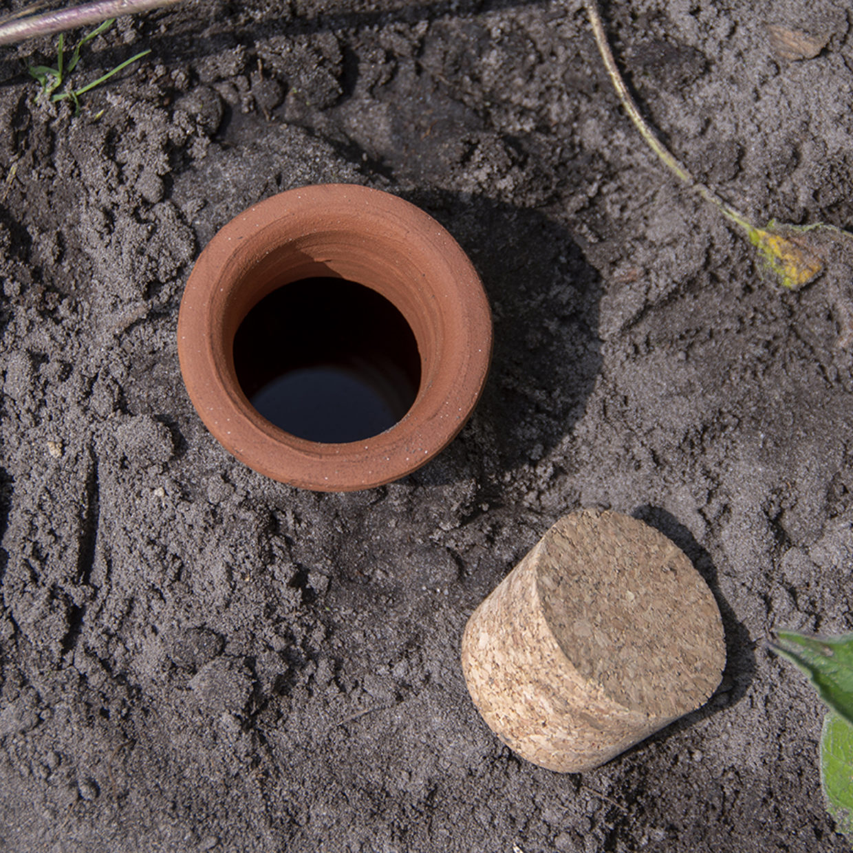 Graaf de pot, tussen de planten in moestuin, border of plantenbak in en vul de olla met water. De wortels van de planten ontrekken het water aan de pot. Deze vorm van irrigatie kan 70% van het tuinwaterverbruik besparen.