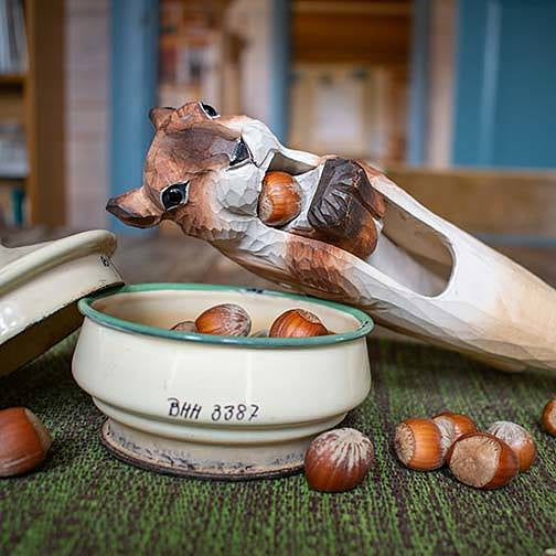 Onze notenkraker is een aparte en degelijke notenkraker in massief lindehout. Het toont een eekhoorn die een noot in zijn handen houdt en jij knijpt in de handvatten om de noot te kraken. Moeren tot 3 cm groot kunnen worden gekraakt. De notenkraker is met de hand gemaakt van gesneden hout en geverfd met milieuvriendelijke kleuren. Over eekhoorns: Eekhoorns slaan noten en eikels op voor de winter en ze kunnen voedsel vinden dat tot wel een meter onder de sneeuw ligt. Eekhoorns eten voedsel dat rijk is aan eiwitten, koolhydraten en vet, omdat ze cellulose niet kunnen verteren. Ze voeden zich voornamelijk met noten, eikels en zaden, maar eten ook kegels, fruit en groene planten. In het vroege voorjaar beginnen de begraven noten te ontkiemen en in plaats daarvan worden de knoppen van de bomen een belangrijk voedsel.